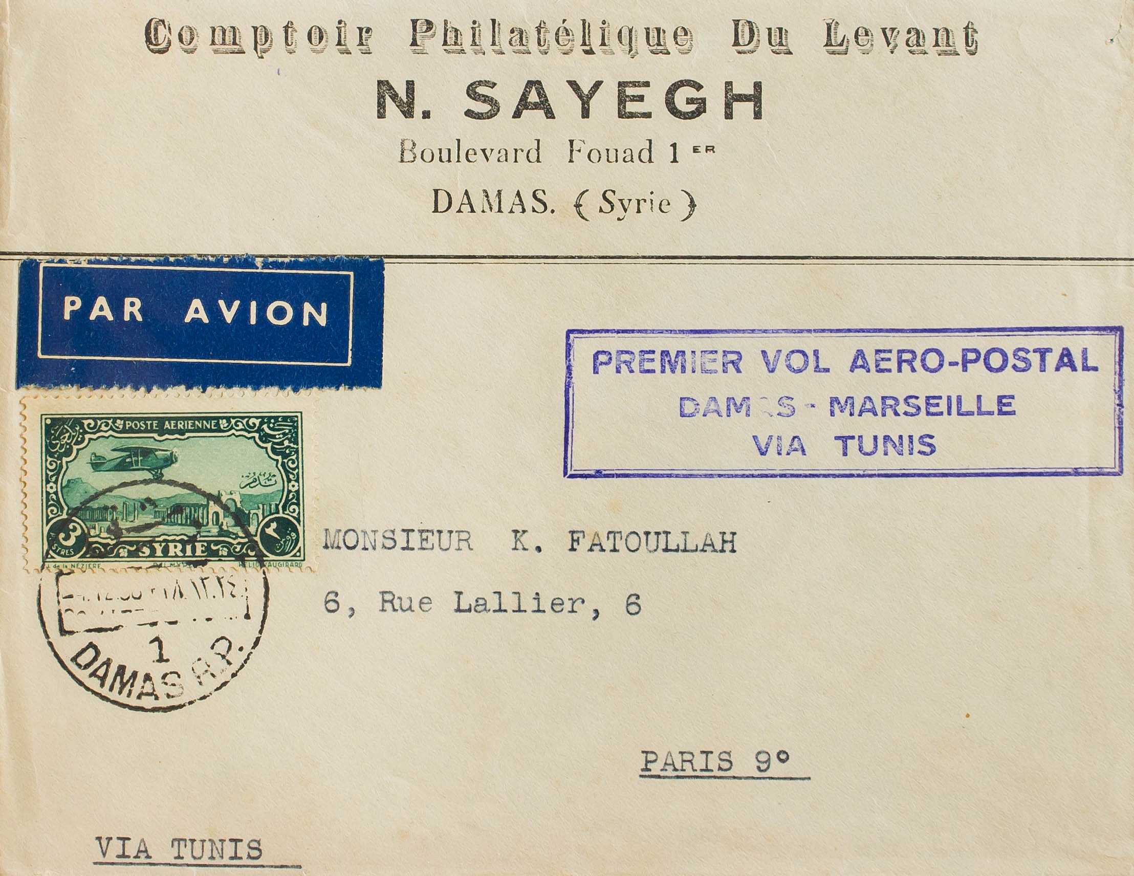 Yvert 53. 1938. 3 pi verde azul. Correo Aéreo de DAMAS a PARIS. En el frente marca PREMIER VOL AERO-POSTAL / DAMAS-MARSEILLE / VIA TUNIS. MAGNIFICA.