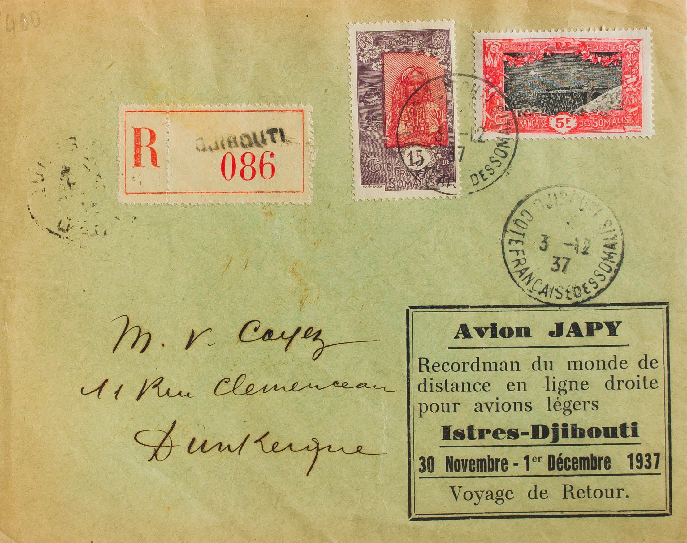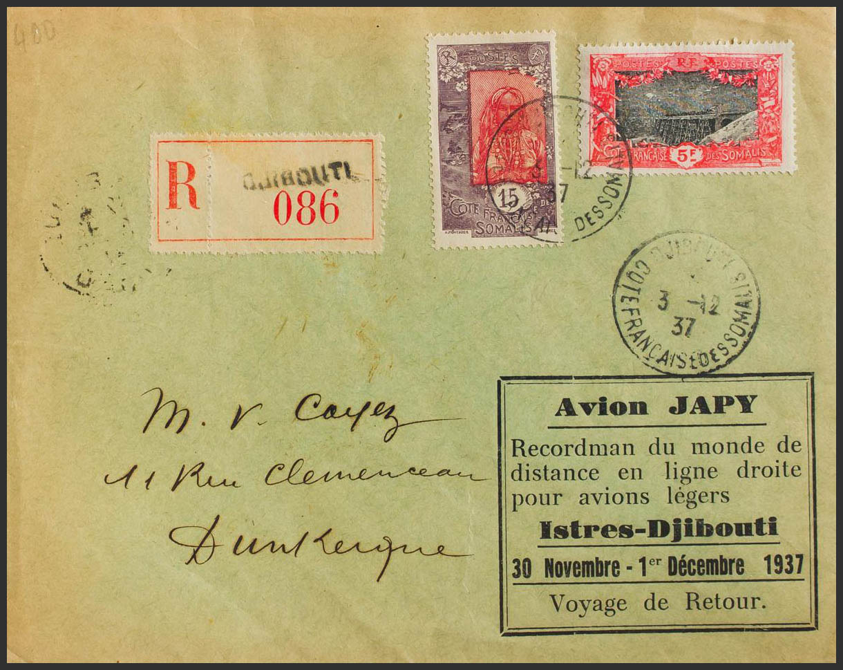Yvert 88, 99. 1937. 15 cts voleta y rojo y 5 fr rojo y negro. Correo Aéreo Certificado de DJIBOUTI a DUNKERKE (sobre pre-impreso AVION JAPY / RECORDMAN DU MONDE DE / DISTANCE EN LIGNE DROITE / POUR AVION LEGERS / ISTRES-DJIBOUTI). Al dorso llegada. MAGNIFICA Y MUY RARA.
