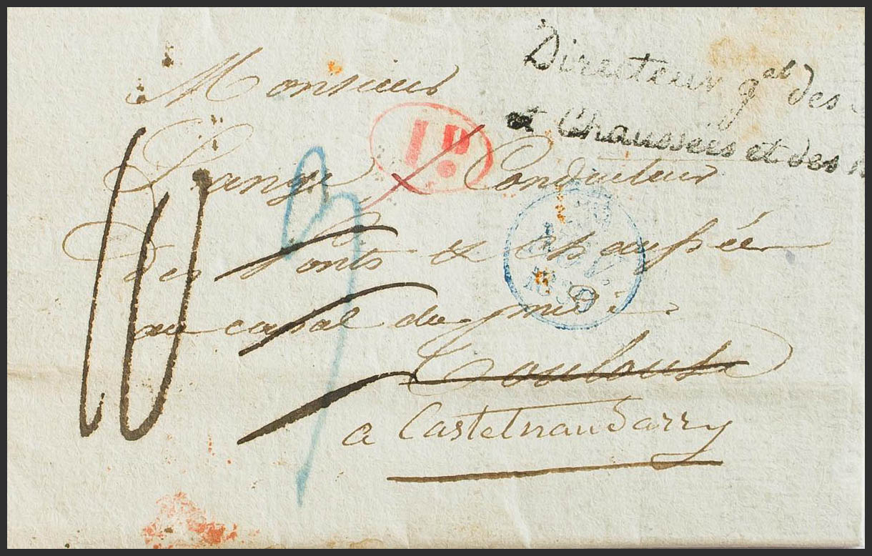 1830. TOURS a TOULOUSE, reexpedida a CASTELNAUDARY. Marca DIRECTEUR GAL DES PONTS / ET CHAUSSES ET DES MINES, en negro y porteos manuscritos. MAGNIFICA.