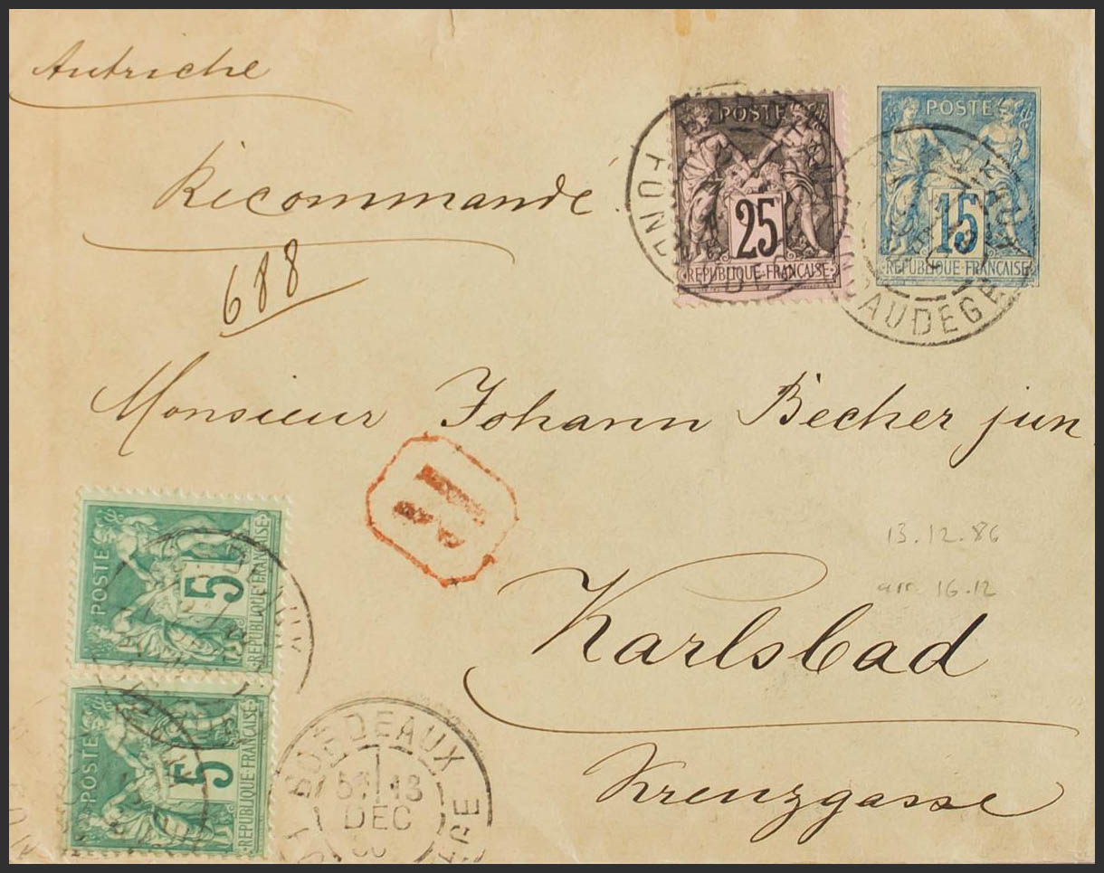 Yvert 75(2), 91. 1886. 15 cts azul sobre Entero Postal Certificado de BURDEOS a KARLSBAD (AUSTRIA), con franqueo complementario de 5 cts verde, dos sellos y 25 cts negro sobre rosa. Matasello BORDEAUX / FONDAUDEGE. MAGNIFICA.