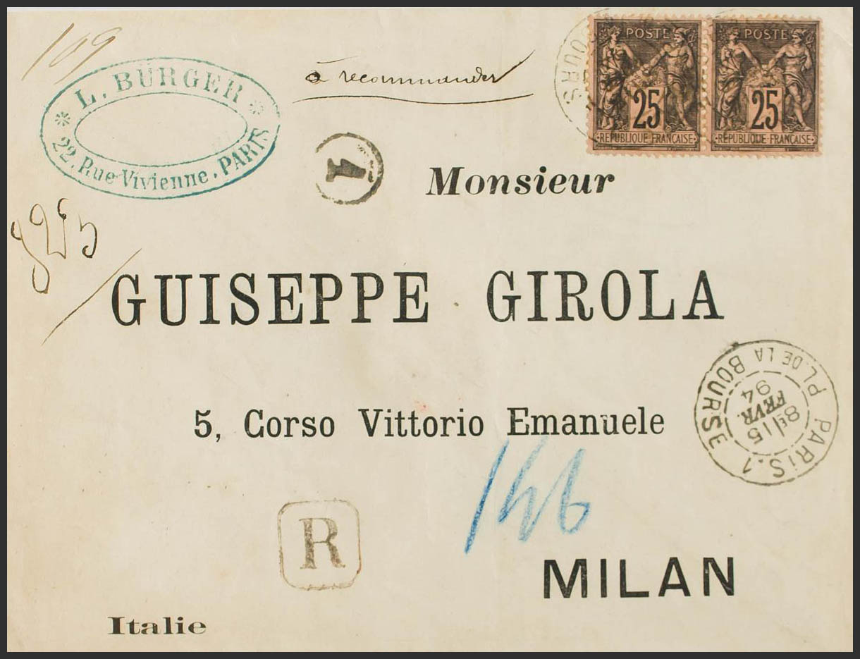 Yvert 97(2). 1894. 25 cts negro sobre rosa, pareja (Tarifa: carta 25 cts + certificado 25 cts). Certificado de PARIS a MILAN (ITALIA). Matasello PARIS.1 / PL.DE LA BOURSE. MAGNIFICA.