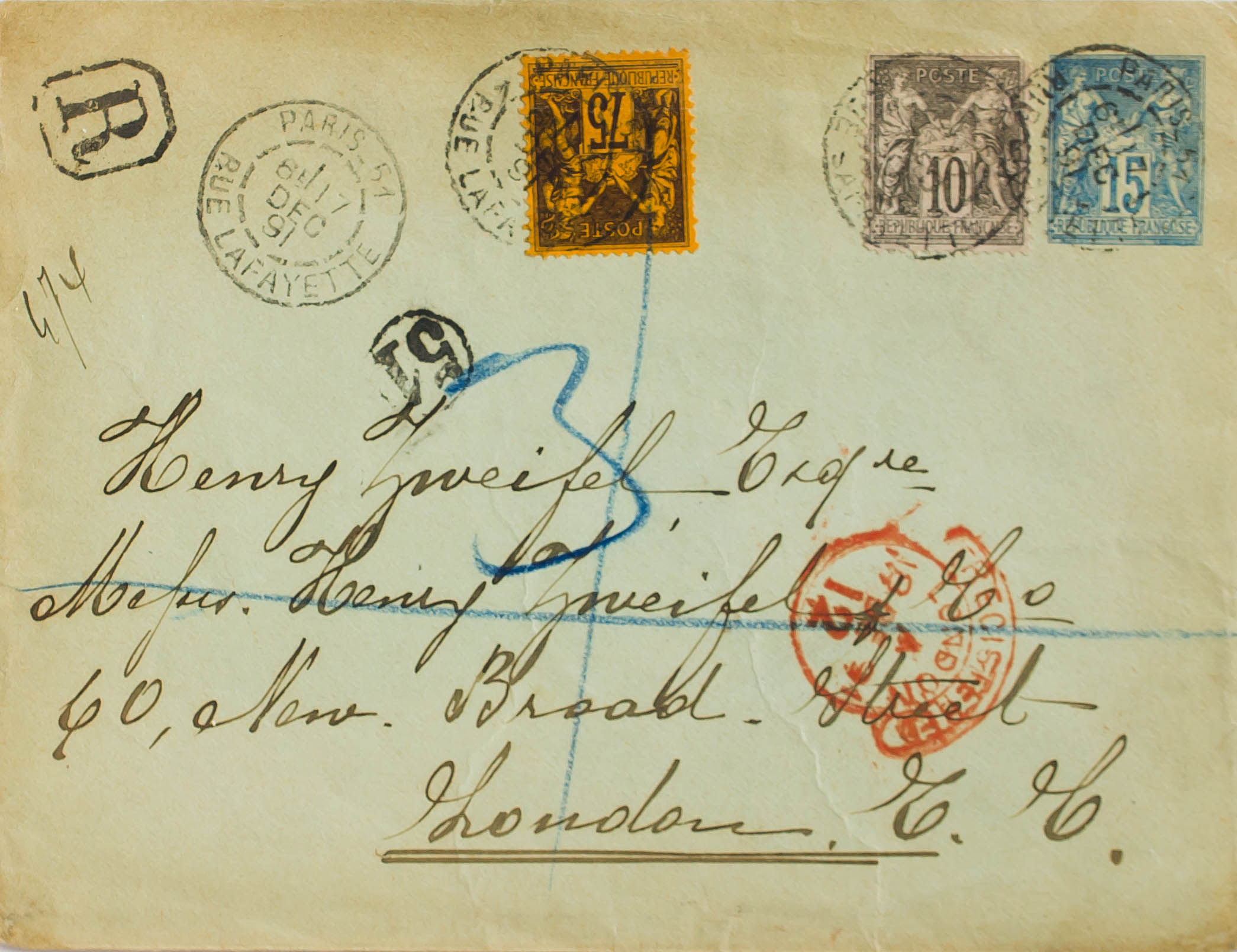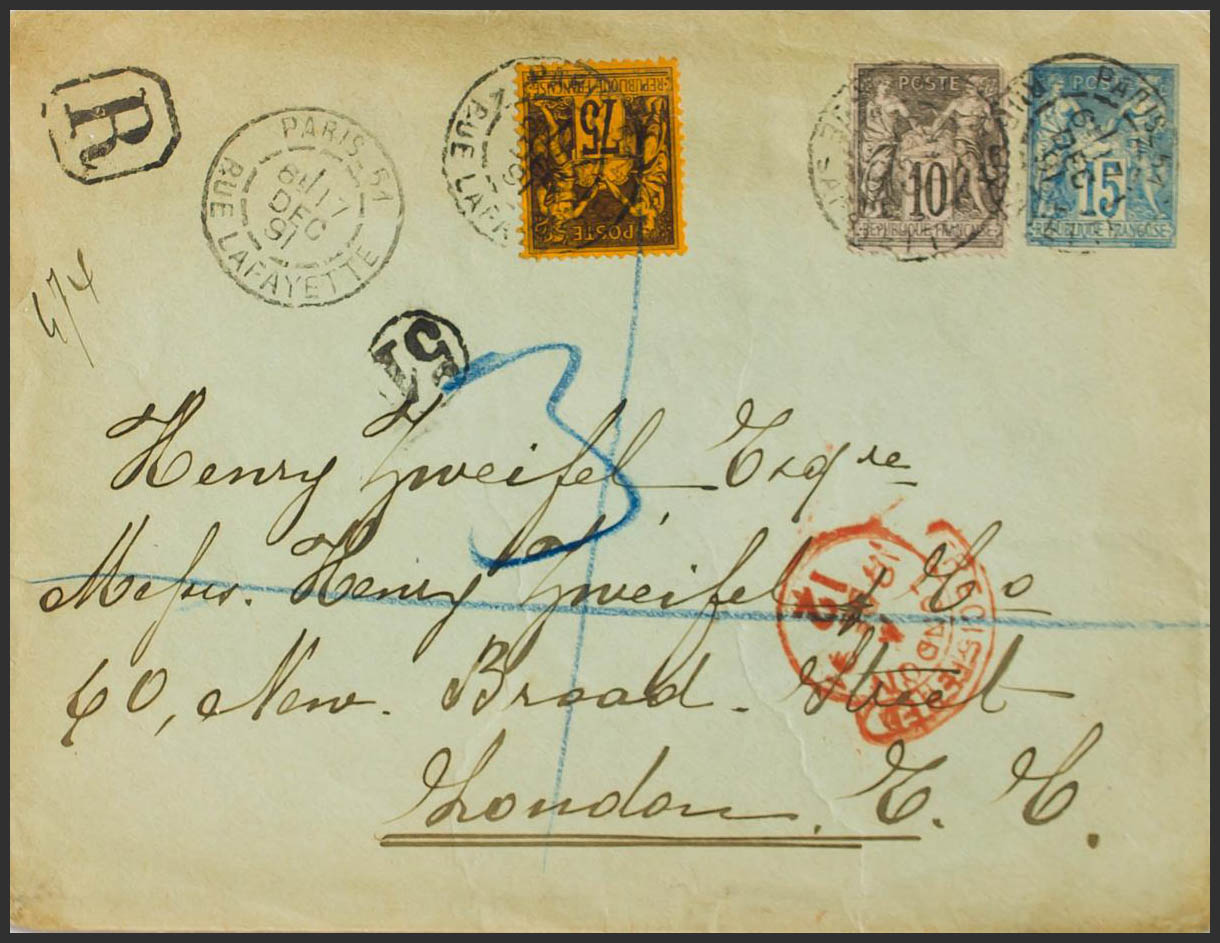 Yvert 89, 99. 1891. 15 cts azul sobre Entero Postal Certificado de PARIS a LONDRES (INGLATERRA), con franqueo complementario de 10 cts negro sobre lila y 75 cts violeta sobre naranja (Tarifa: carta de triple porte 75 cts + certificado 25 cts). Matasello PARIS 51 / RUE LAFAYETTE, en el frente llegada, MAGNIFICA Y RARO FRANQUEO.