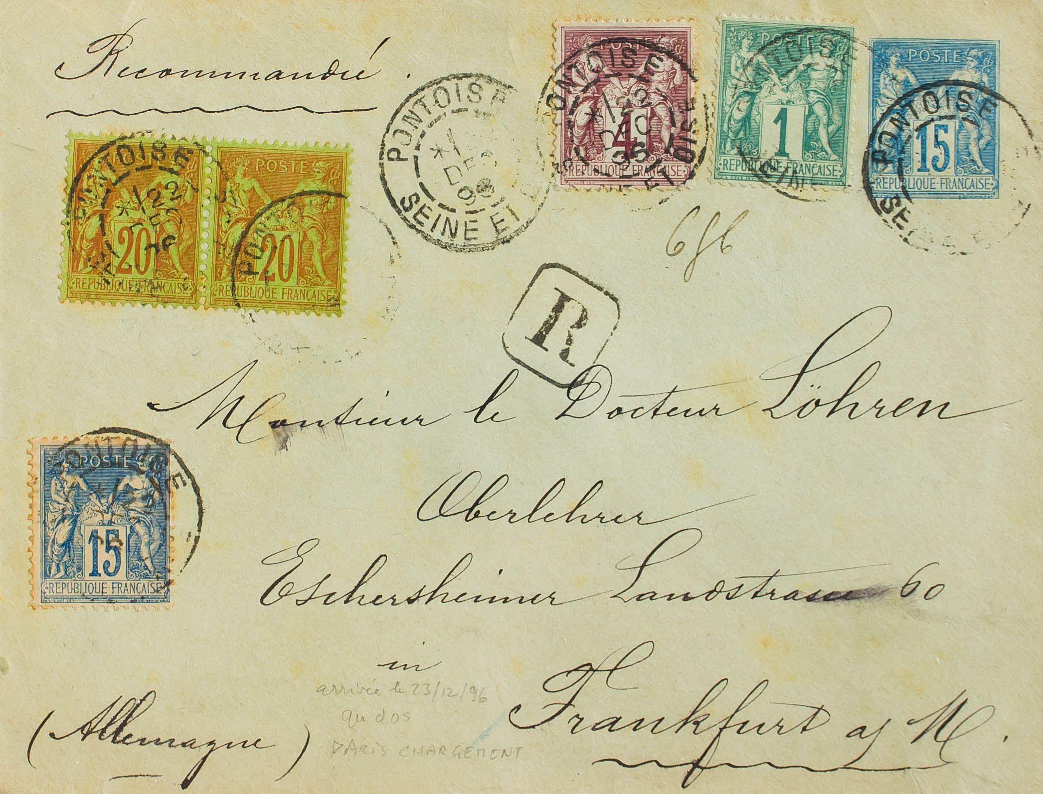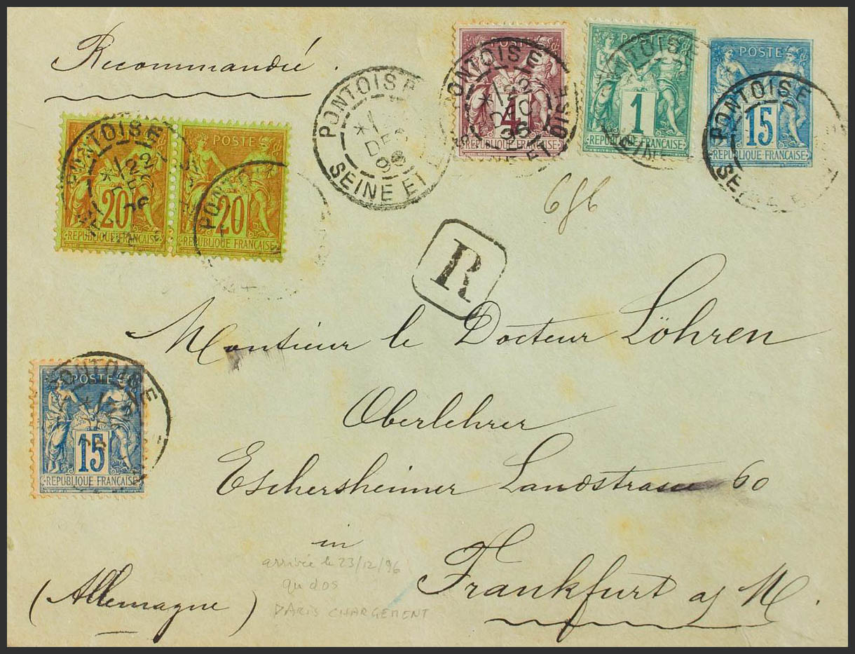 Yvert 74, 88, 90, 9. 1896. 15 cts azul sobre Entero Postal Certificado de PONTOISE a FRANKFURT (ALEMANIA), con franqueo complementario de 1 cts verde, 4 cts lila, 15 cts azul y 20 cts rojo sobre verde, pareja (Tarifa: carta de doble porte 15-30 gramos 50 cts + certificado 25 cts). Matasello PONTOISE / SEINE ET OISE, al dorso fechador 12 PARIS 12 / CHARGEMENTS, y llegada. MAGNIFICA Y ESPECTACULAR FRANQUEO.