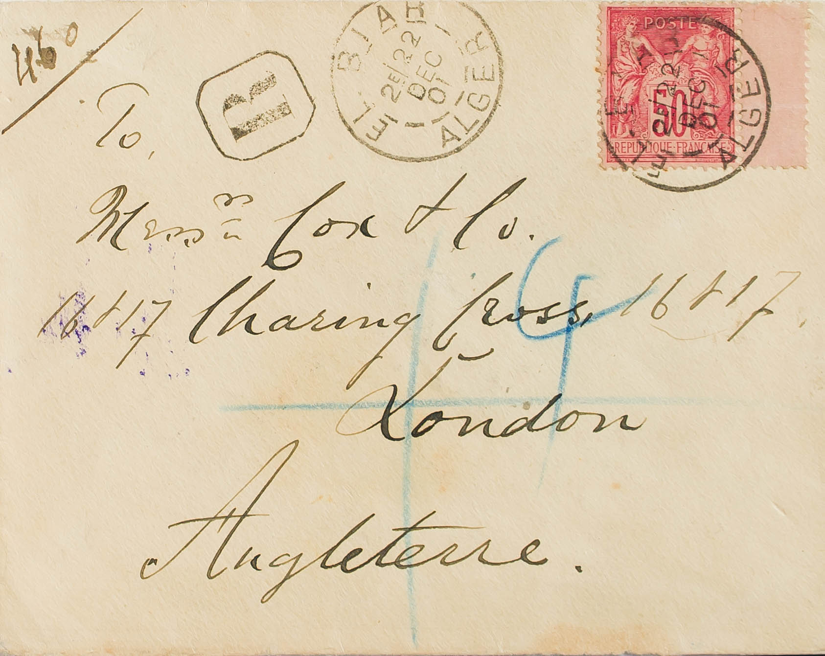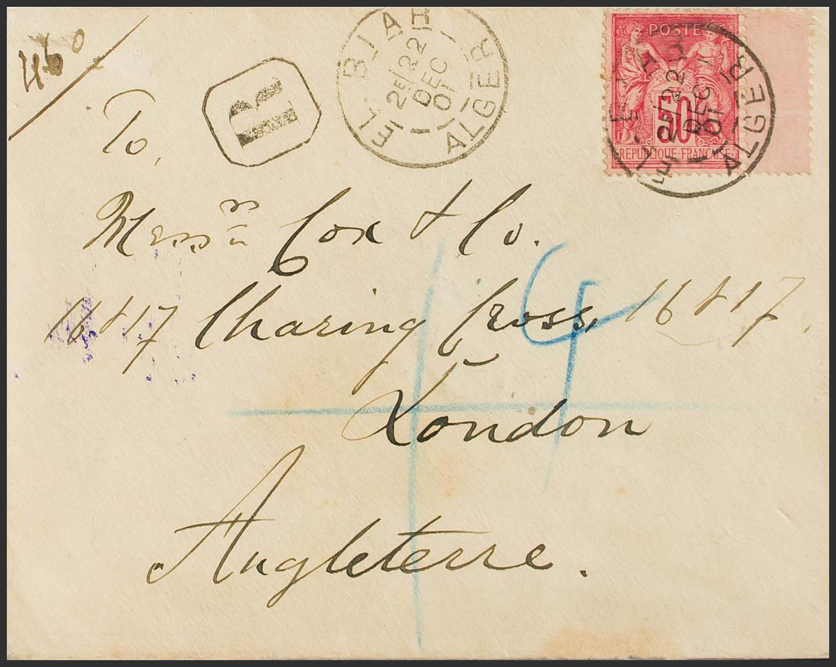 Yvert 98. 1901. 50 cts rosa, borde de hoja (Tarifa: carta 25 cts + certificado 25 cts). EL BIAR (ARGELIA) a LONDRES. Matasello EL BIAR / ALGER, al dorso llegada. MAGNIFICA Y RARA CON ORIGEN EN ARGELIA.