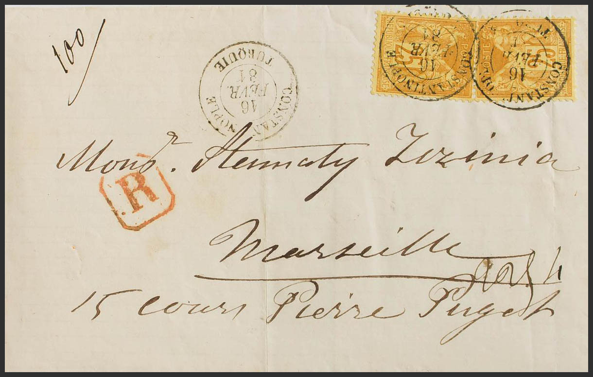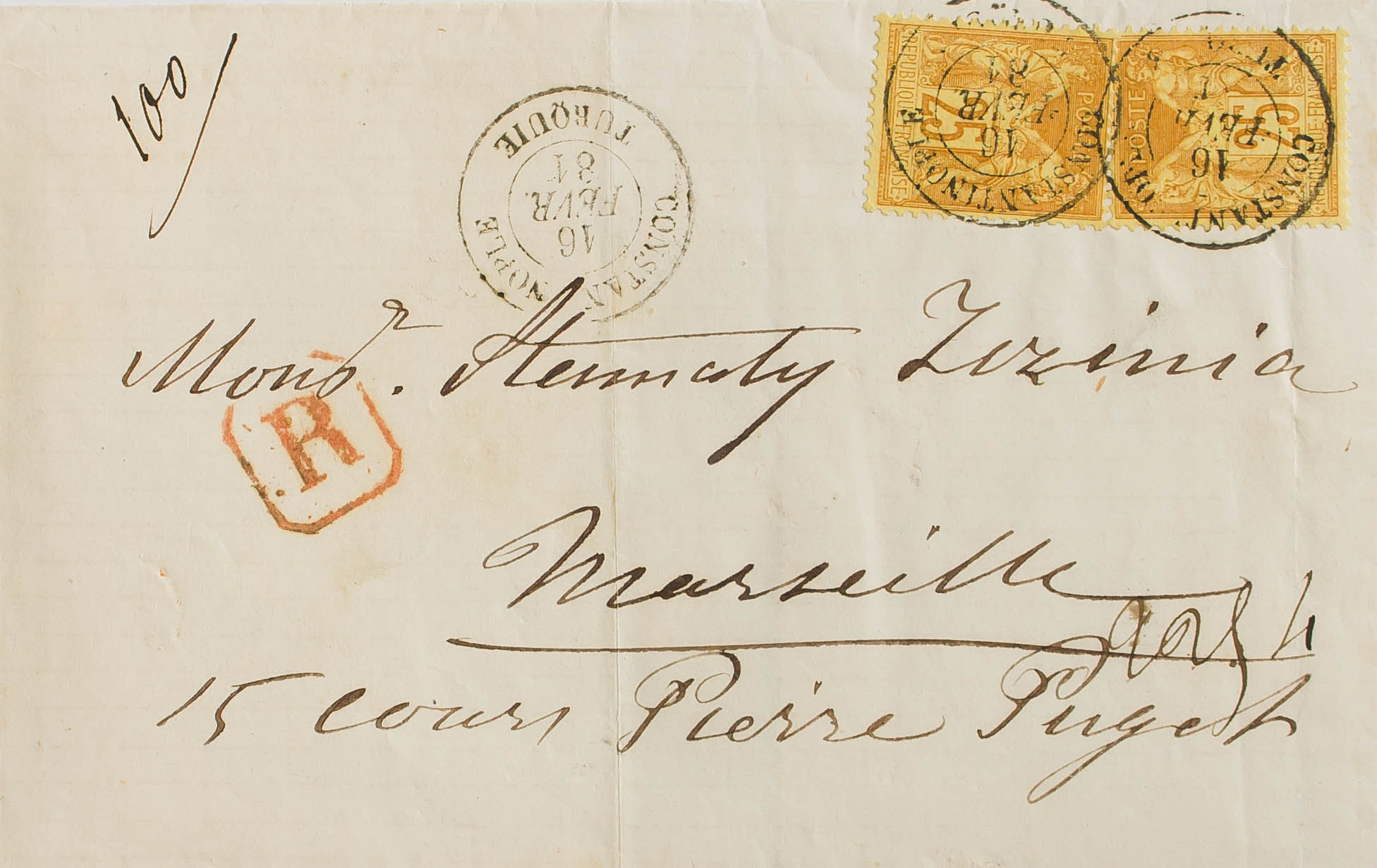 Yvert 92(2). 1881. Sello de Francia de 25 cts bistre sobre amarillo, dos sellos (Tarifa: carta 25 cts + certificado 25 cts). CONSTANTINOPLA a MARSELLA. Matasello CONSTANTINOPLE / TURQUIE. MAGNIFICA.