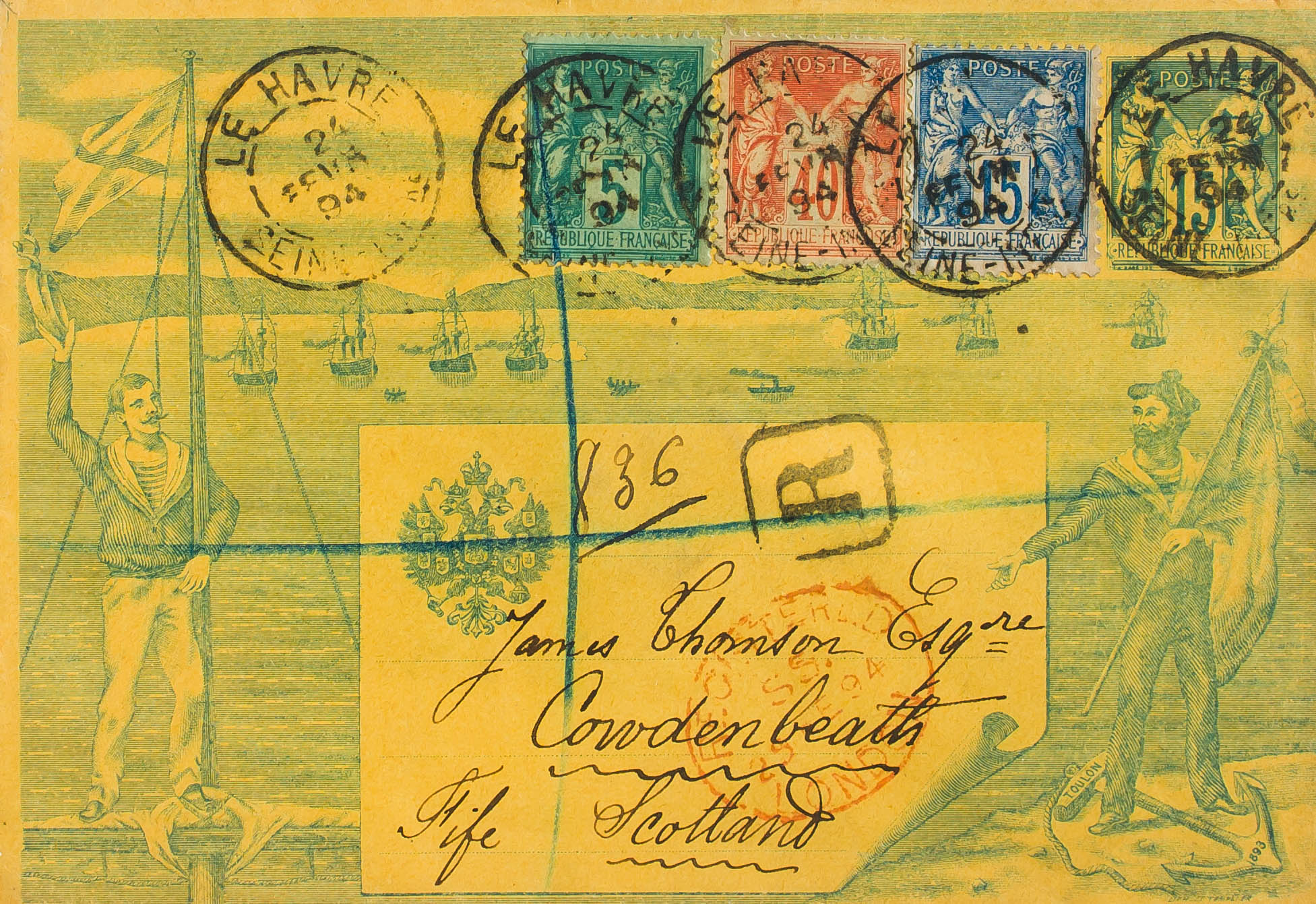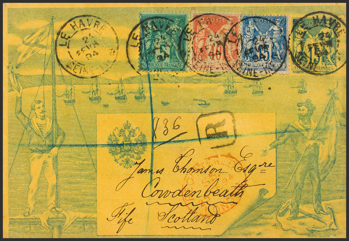 Yvert 70, 75, 90. 1894. 15 cts azul sobre Entero Postal conmemorativo de la visita de la Escuadra Rusa Certificado de LE HAVRE a COWDENBEATH (ESCOCIA), con franqueo complementario de 40 cts naranja, 5 cts verde y 15 cts azul. Al dorso llegada. MAGNIFICO Y ESPECTACULAR FRANQUEO.