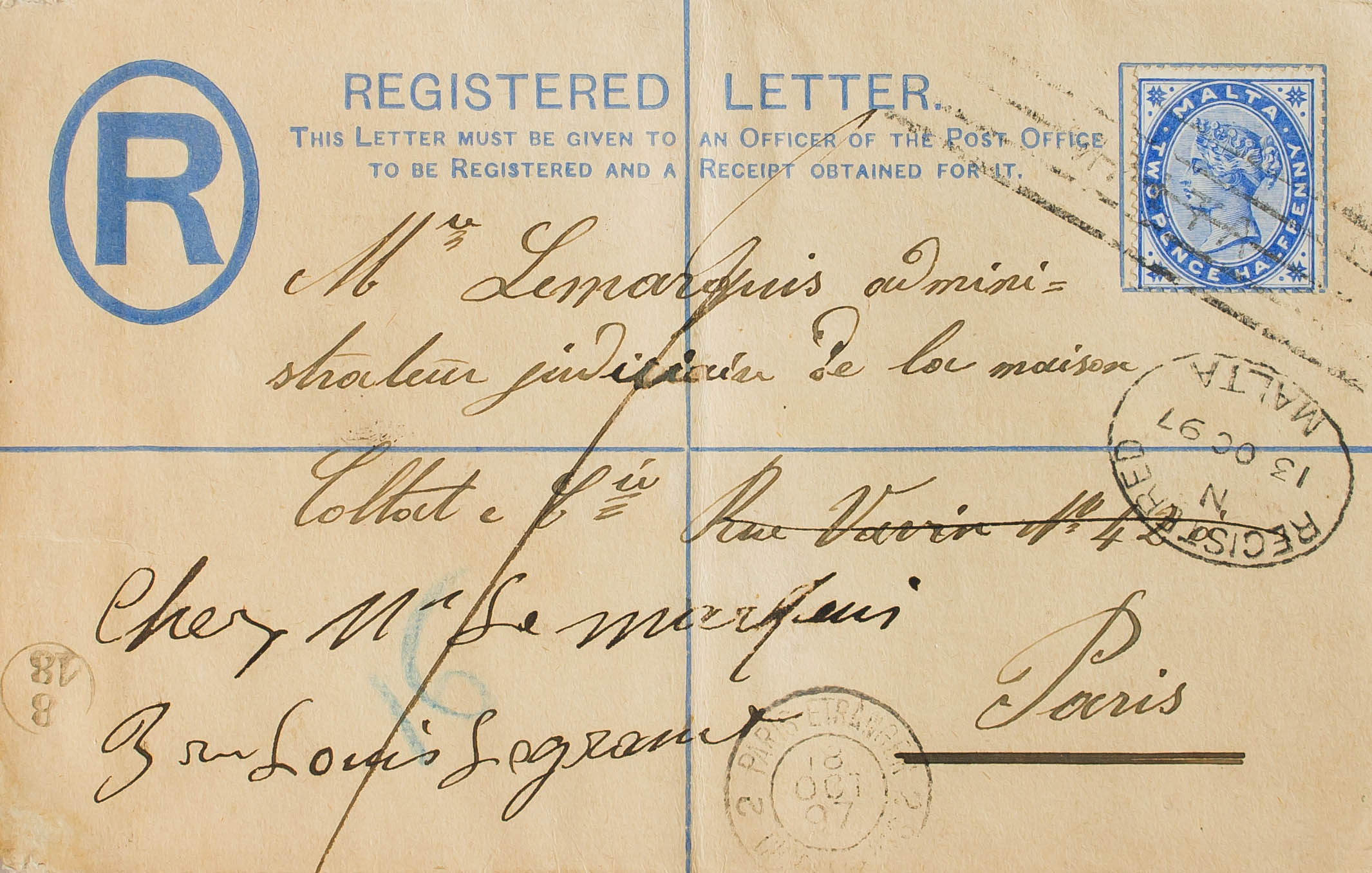 Yvert 8. 1897. 2 p azul sobre Entero Postal Certificado de MALTA a PARIS, con franqueo complementario de 2 ½ p ultramar. En el frente matasello REGISTERED / MALTA y ambulante francés. MAGNIFICO.