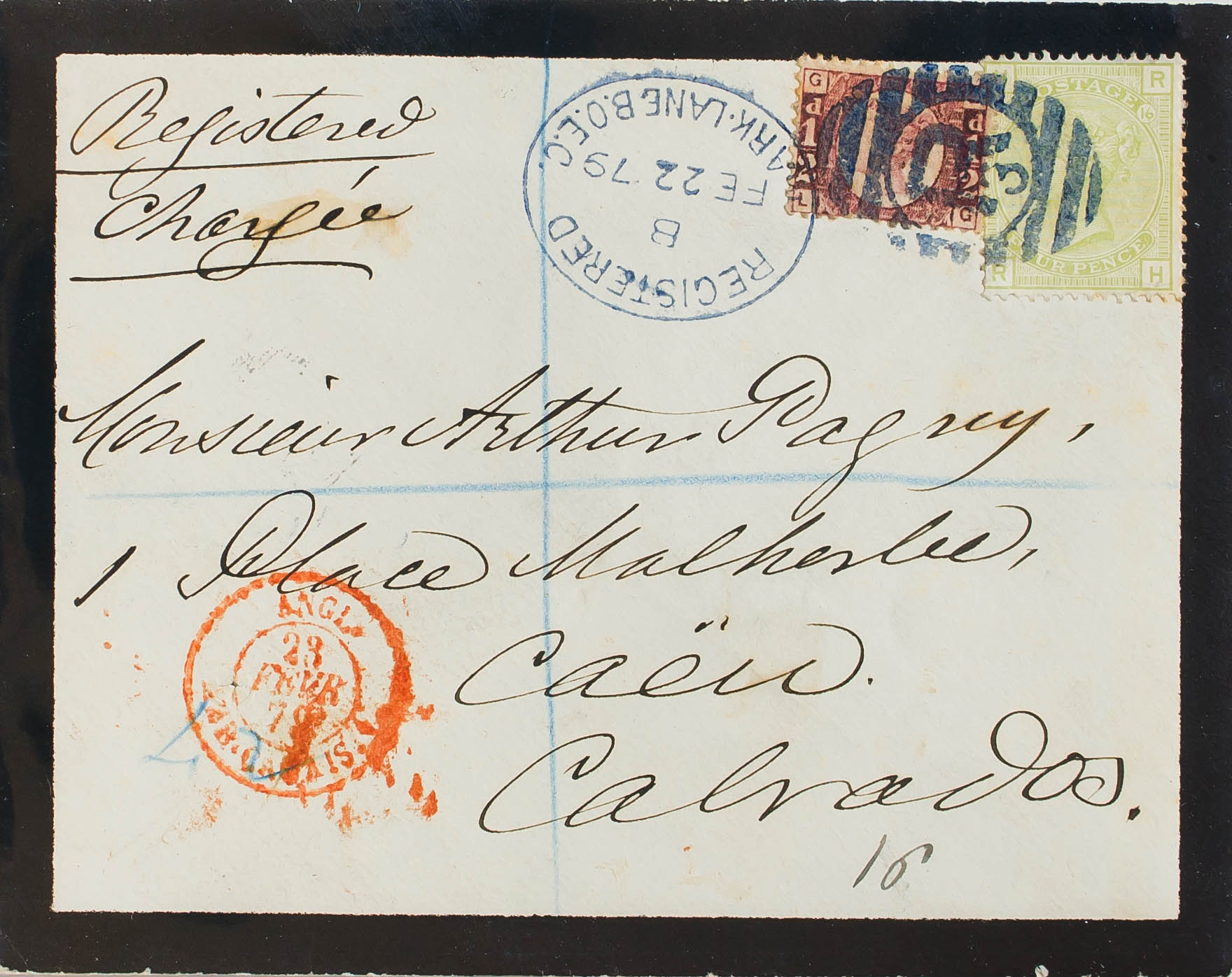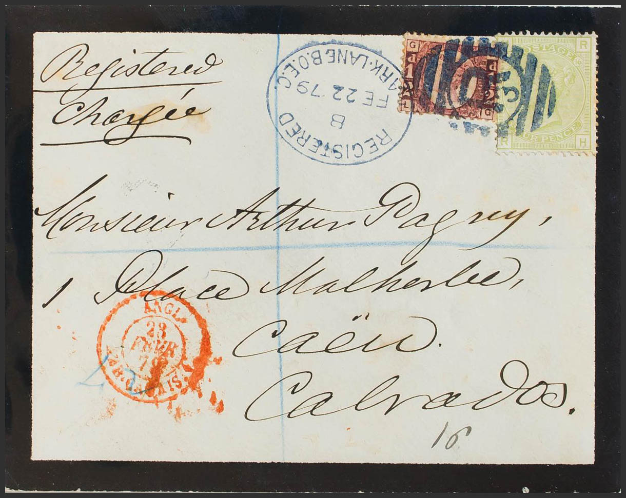 Yvert 59, 49. 1879. 4 p verde oliva Plancha 16 y ½ p rojo carmín. Certificado de LONDRES a CAEN (FRANCIA). Matasello PARRILLA "R3" y fechador REGISTERED / MARK. LANE. B.O.E.C. MAGNIFICA Y RARO EL 4 P SOBRE CARTA.