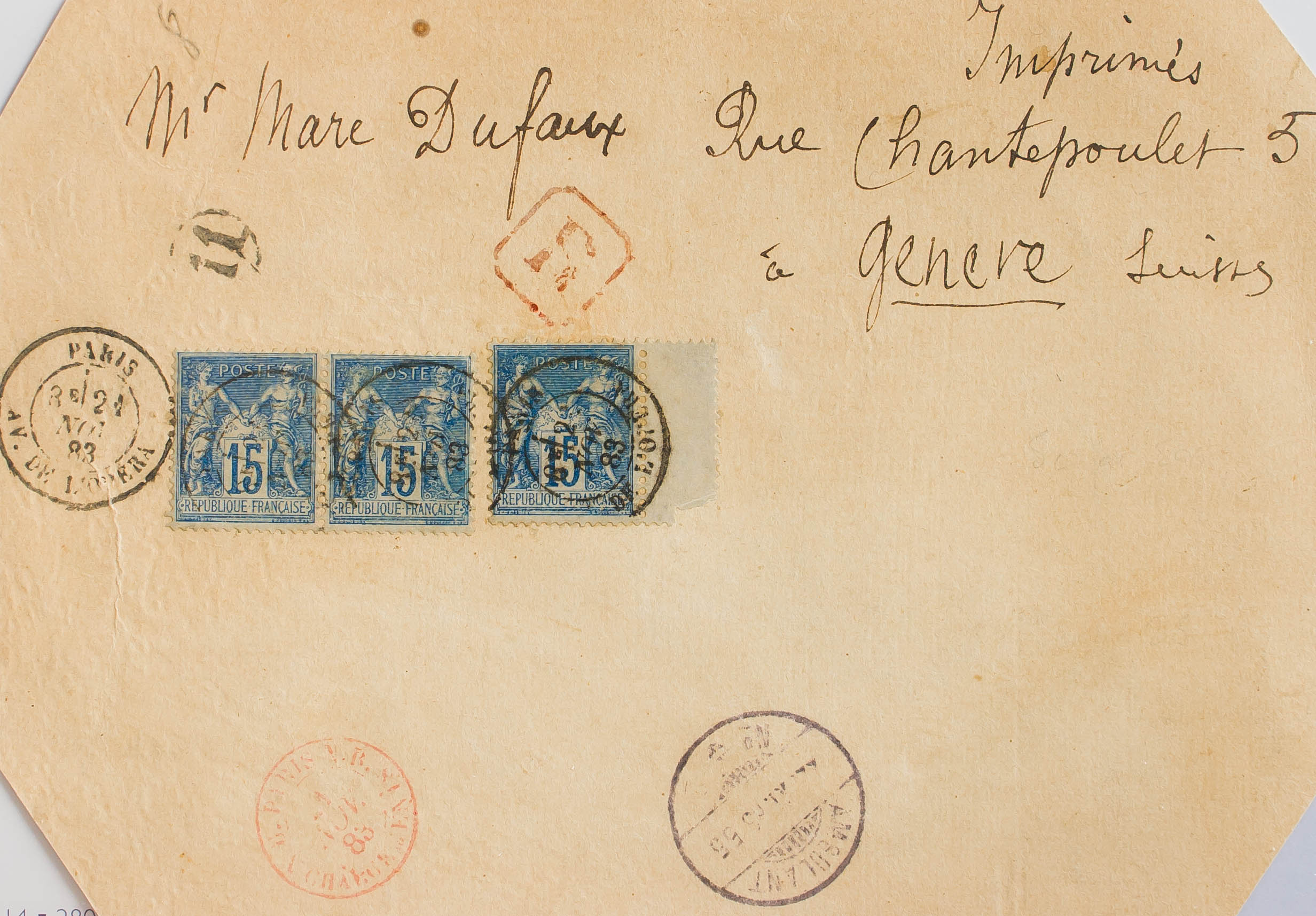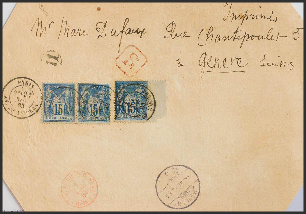 Yvert 90(3). 1883. 15 cts azul, tres sellos. Tarjetón-Ilustrado (ángulos cortados) Certificado de PARIS a GINEBRA. En el frente llegada (tarifa de impresos). MAGNIFICO.