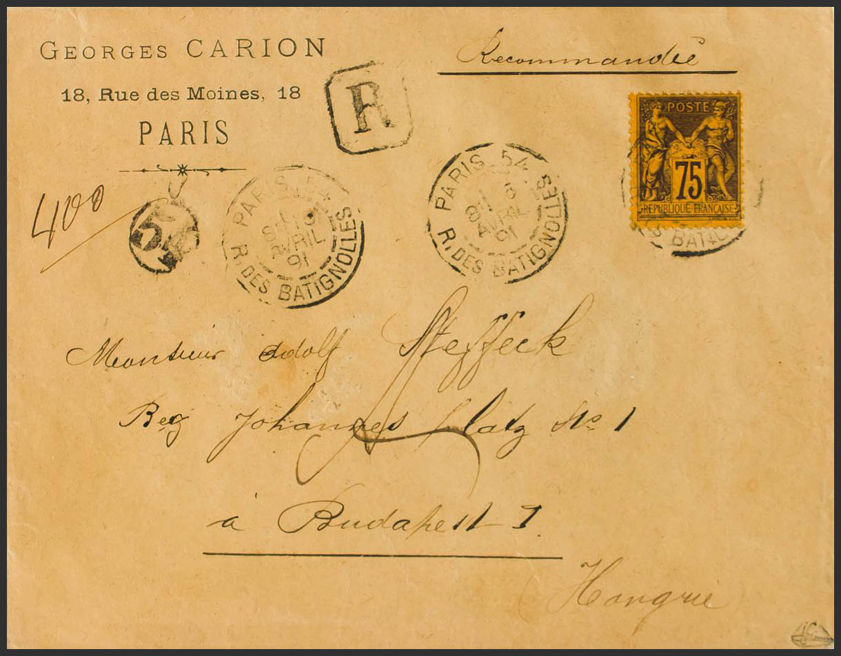Yvert 99. 1891. 75 cts violeta sobre amarillo. Certificado de PARIS a BUDAPEST (HUNGRIA). Matasello PARIS-54 / R. DES BATIGNOLES, al dorso llegada. MAGNIFICO Y RARO.