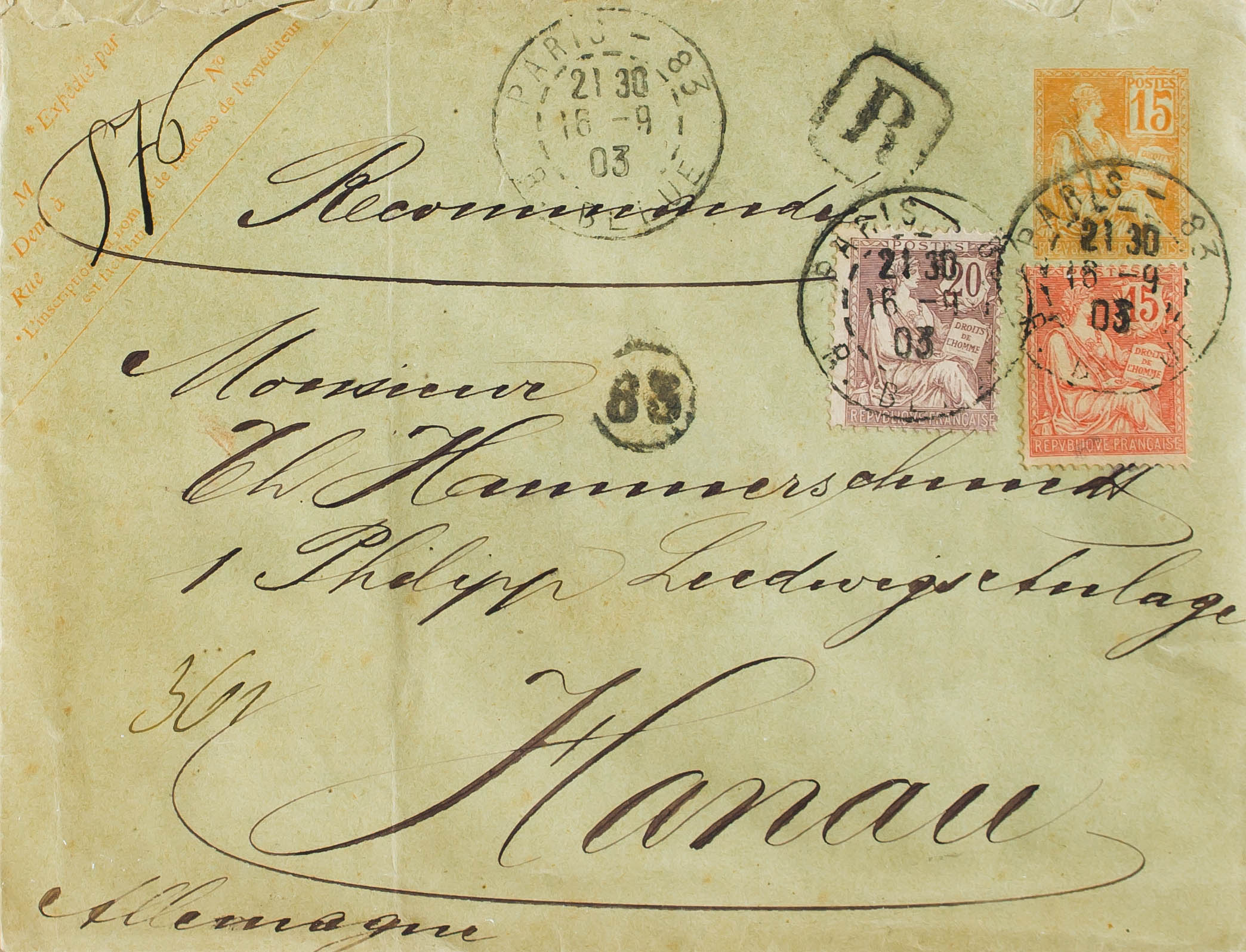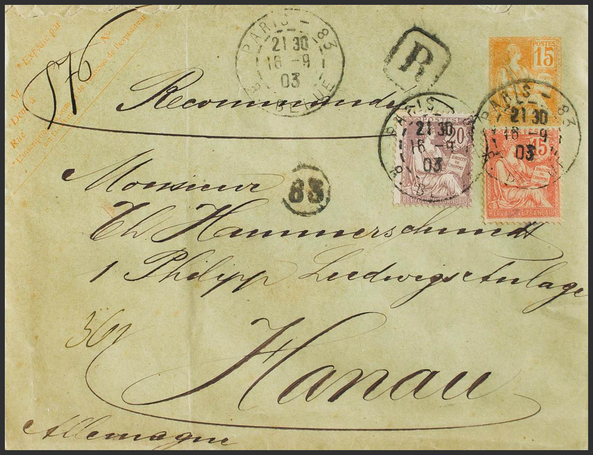 Yvert 125, 126. 1903. 15 cts naranja sobre Entero Postal Certificado de PARIS a HANAU (ALEMANIA), con franqueo complementario de 15 cts bermellón y 20 cts lila. MAGNIFICO.