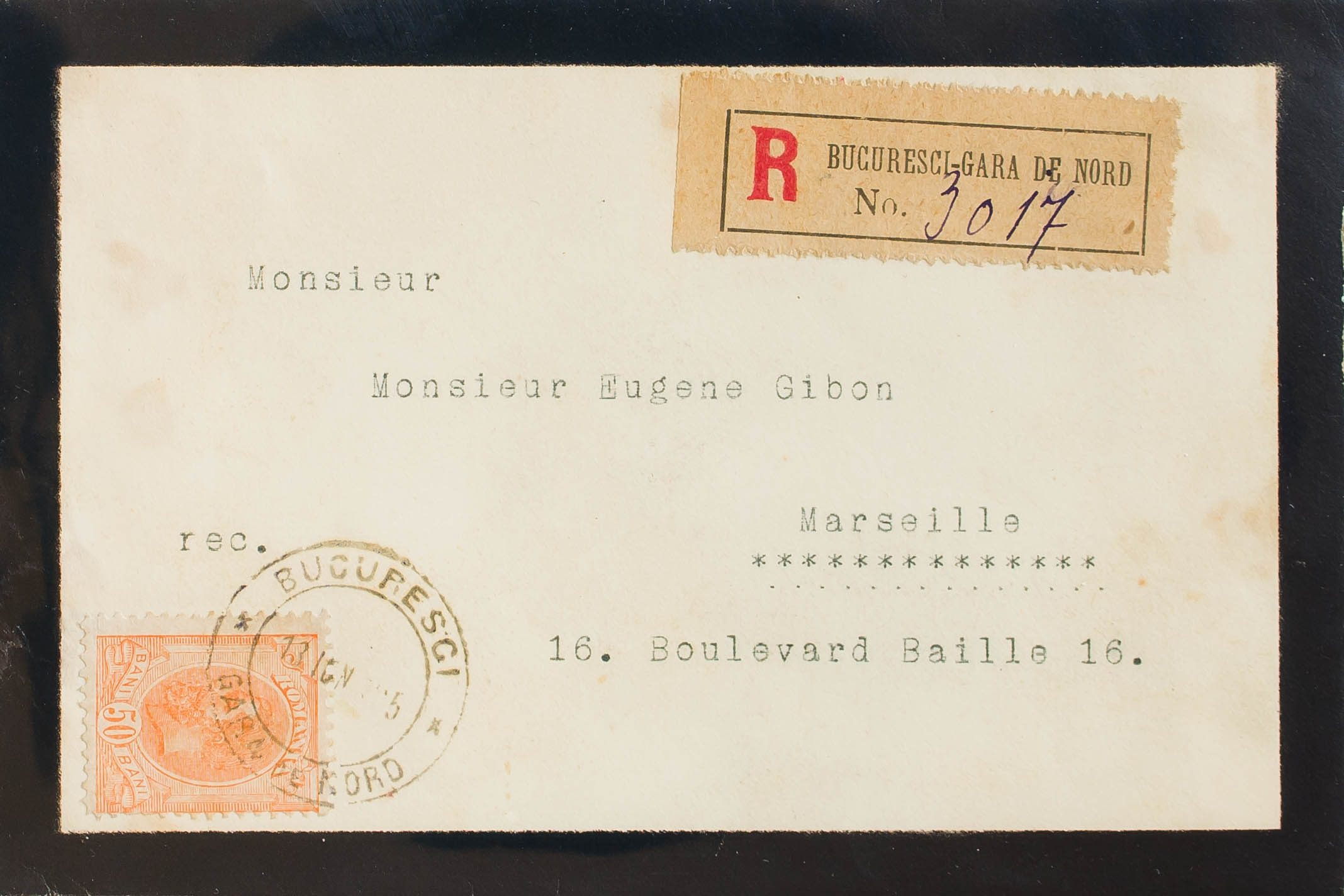 Yvert 134. 1905. 50 b naranja. Carta Certificada de BUCAREST a MARSELLA (FRANCIA) (remite MAISON DE S.M. LA REINE). Matasello BUCURESCI / GARA DE NORD. MAGNIFICA.