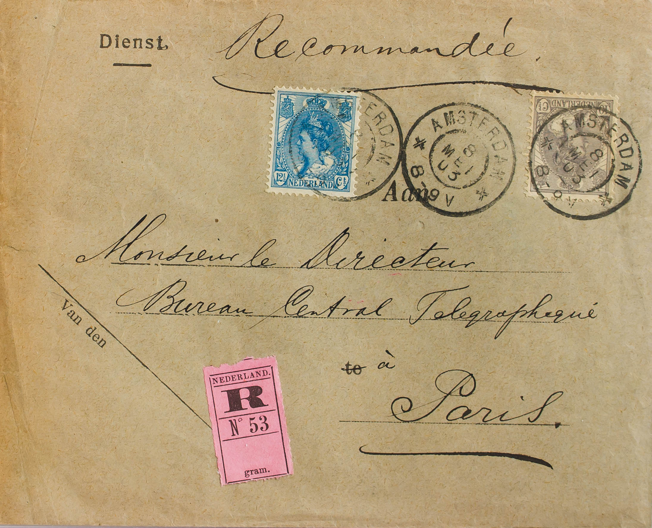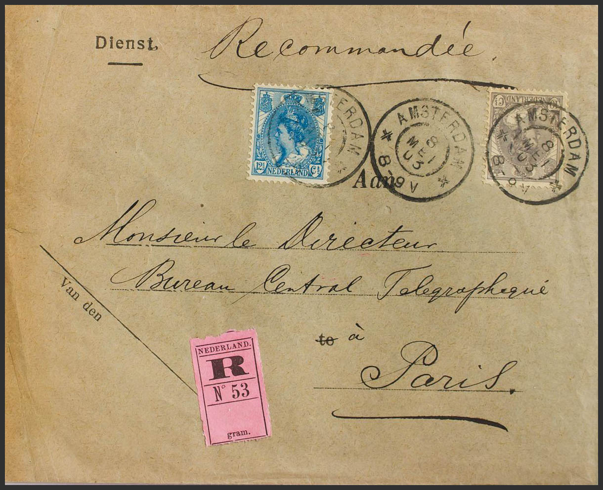 Yvert 53, 54. 1903. 10 cts gris y 12 ½ cts azul. Certificado de AMSTERDAM a PARIS. MAGNIFICO.