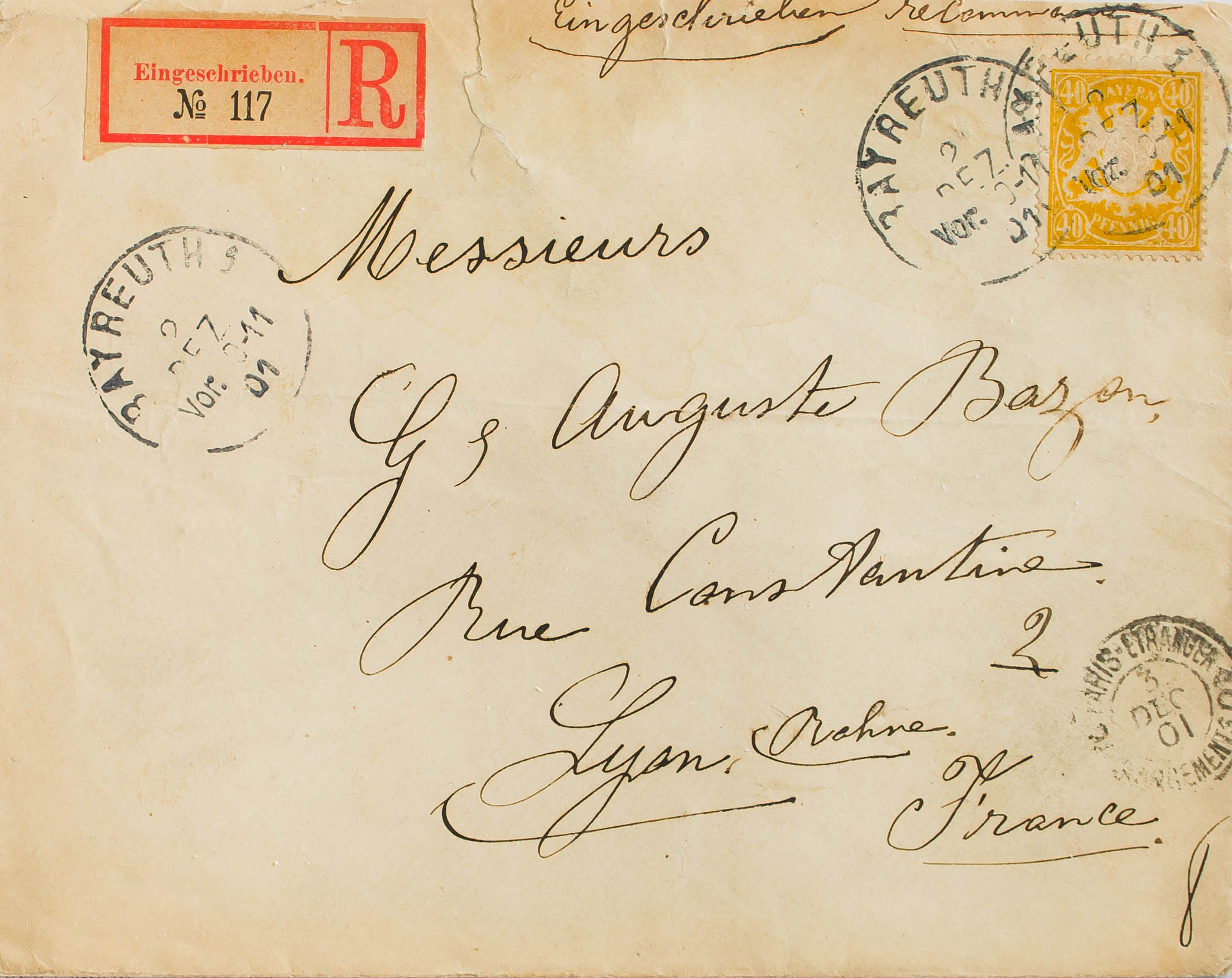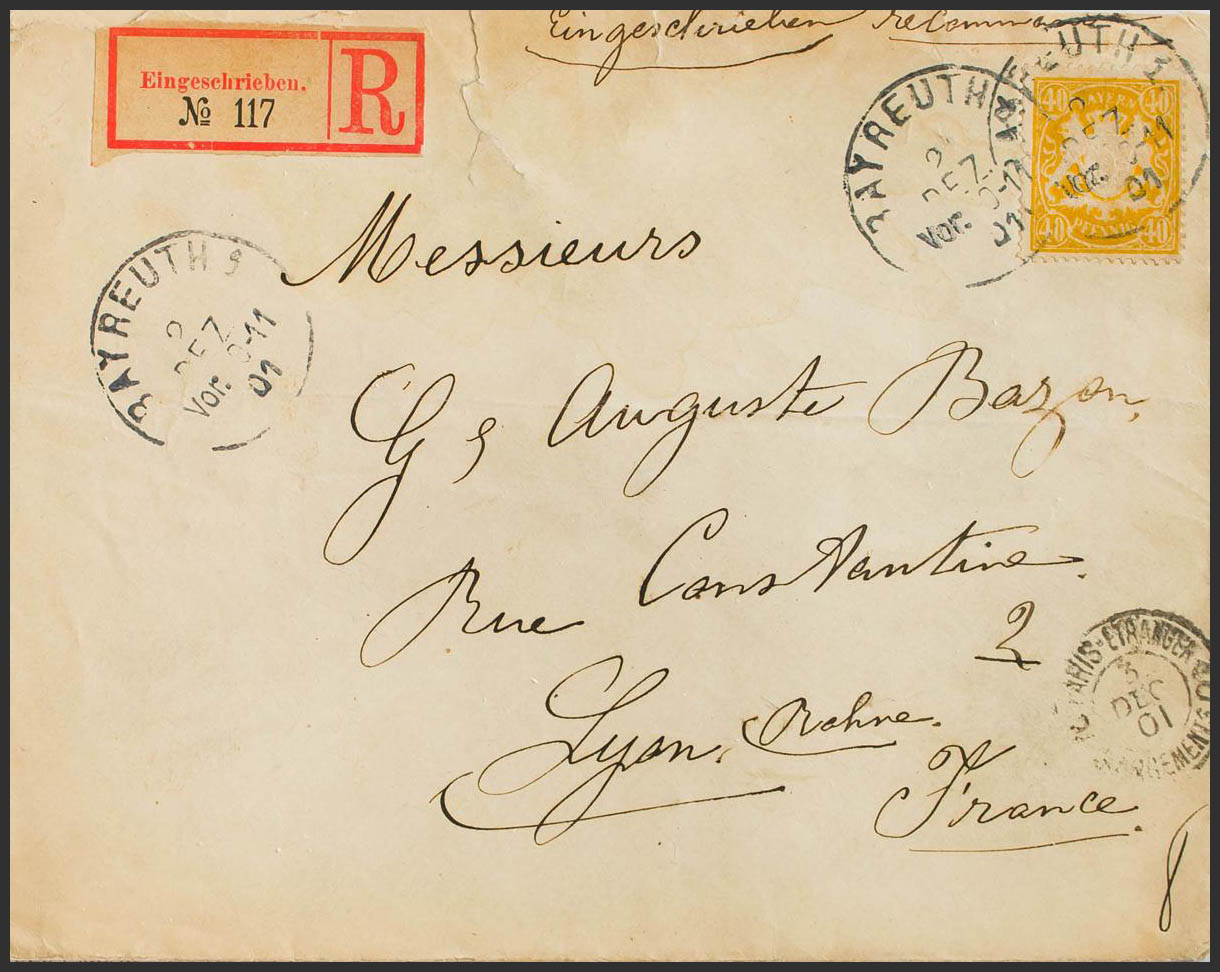 Yvert 68. 1901. 40 p amarillo. Certificado de BAYREUTH a LYON (FRANCIA). Al dorso llegada. MAGNIFICO.