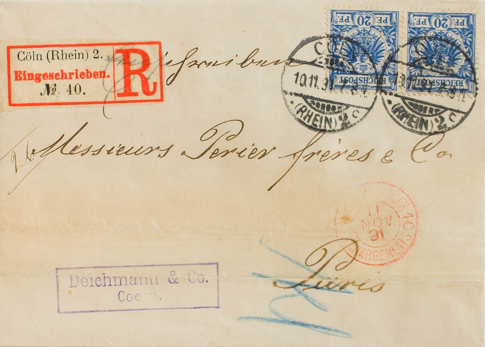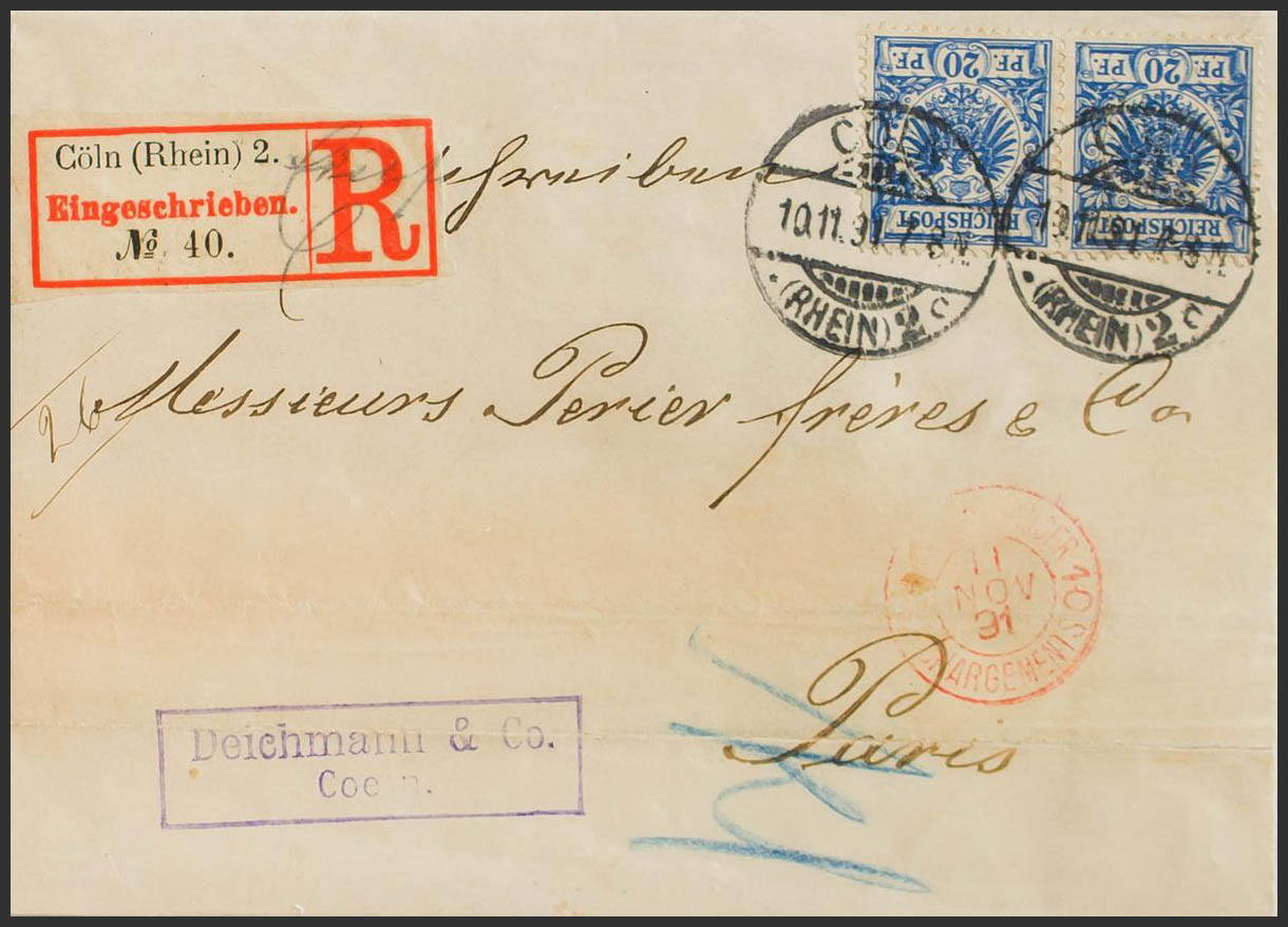 Yvert 48(2). 1891. 20 p azul, pareja. Certificado de COLONIA a PARIS. Matasello COELN / (RHEIN) 2, en el frente fechador PARIS / 10 CHARGEMENTS 10, en rojo. MAGNIFICO.