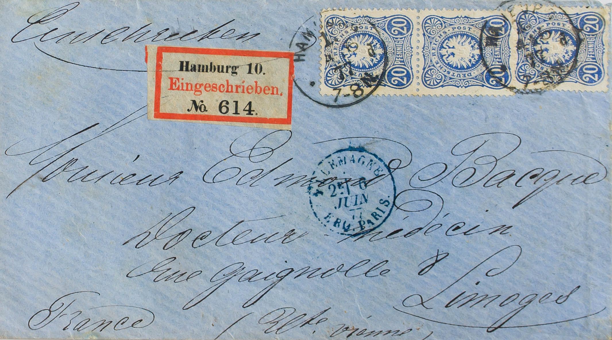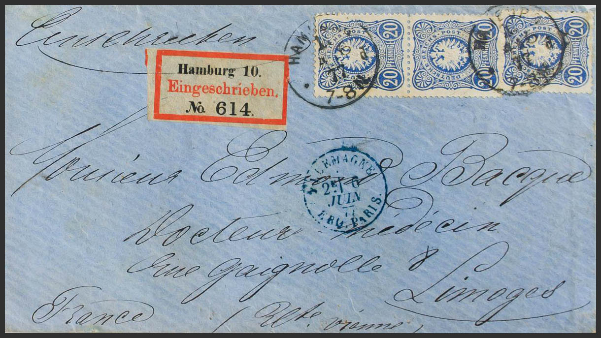 Yvert 33(3). 1877. 20 p azul, tres sellos. Certificado de HAMBURGO a LIMOGES (FRANCIA). Matasello fechador HAMBURG. MAGNIFICA.