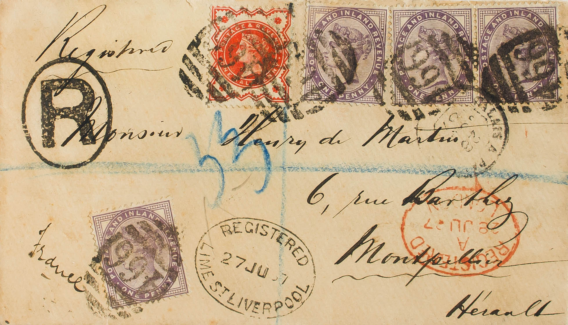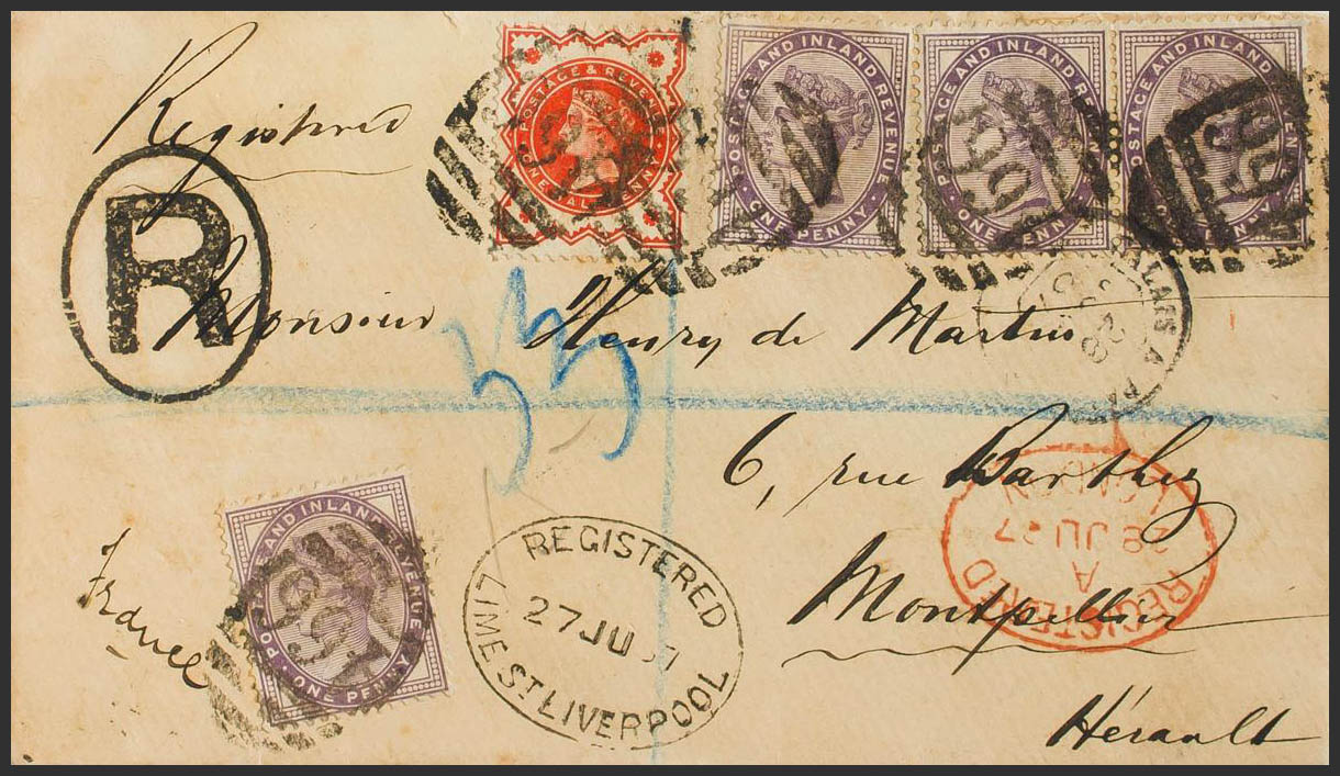 Yvert 73(4), 91. 1887. 1 p violeta, cuatro sellos y ½ p rojo. Certificado de LIVERPOOL a MONTPELLIER (FRANCIA). Matasello numeral "466" y en el frente fechadores REGISTERED / LIME ST. LIVERPOOL, REGISTERED / LONDON y marca "R" aplicada en origen. MAGNIFICA Y RARO FRANQUEO.