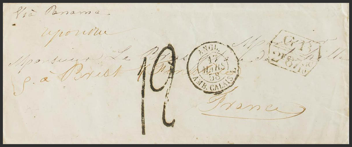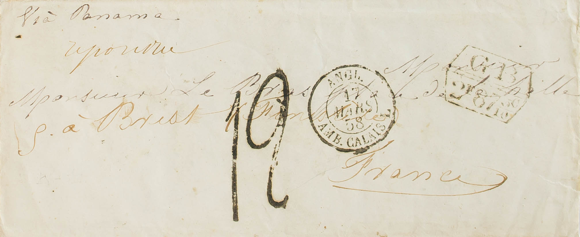 1858. Dirigida a BREST (FRANCIA). Marca de intercambio Franco-Británico G.B. / 2F 87C, ambulante ANGL. / AMB.CALAIS L. y porteo "12". MAGNIFICA.