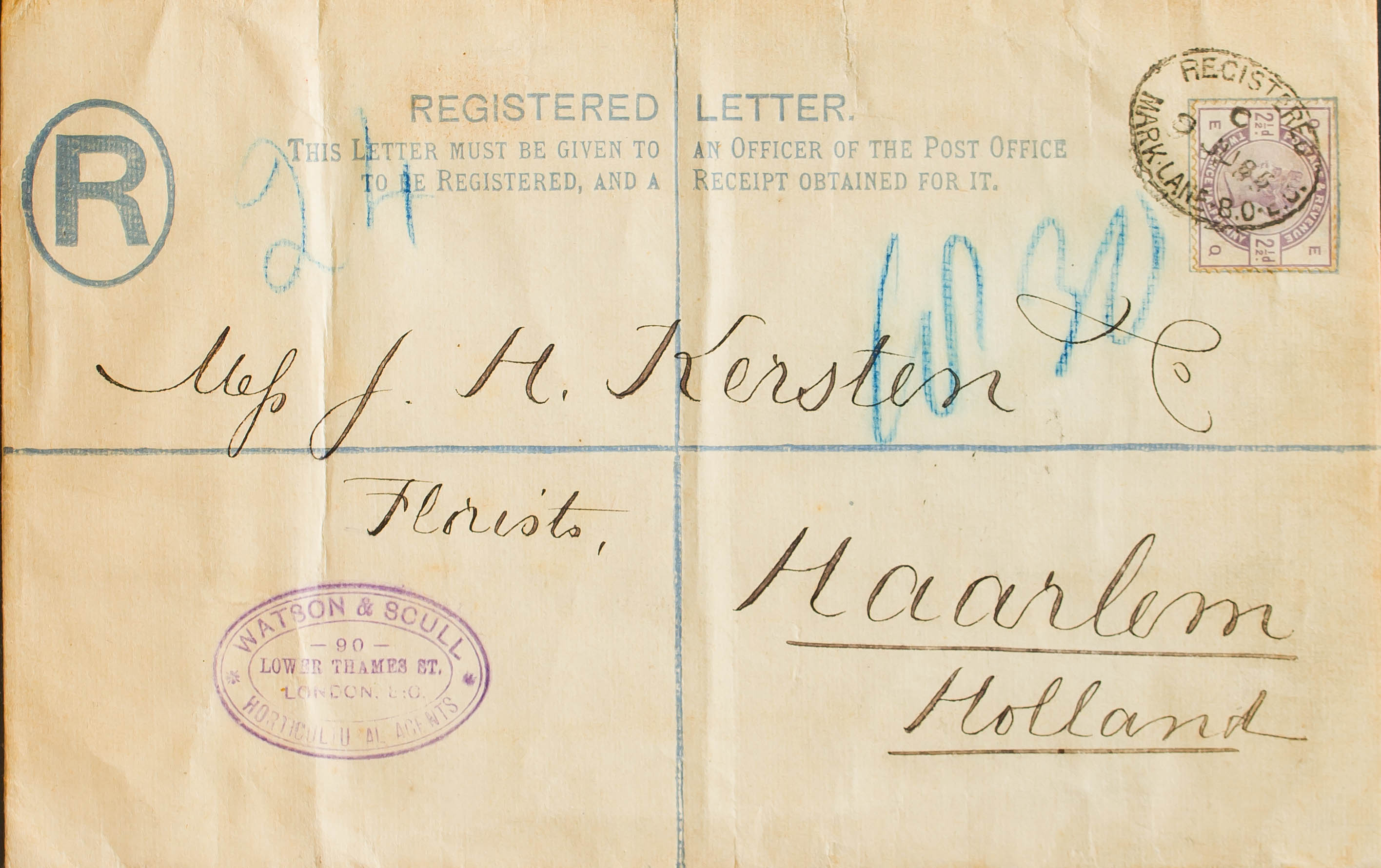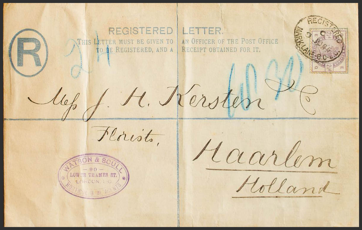 Yvert 78. 1885. 2 p ultramar sobre Entero Postal Certificado de LONDRES a HAARLEM (HOLANDA), con franqueo complementario de 2 ½ p violeta. Matasello REGISTERED / MARK LANE B.O.E.C., al dorso llegada. MAGNIFICA.