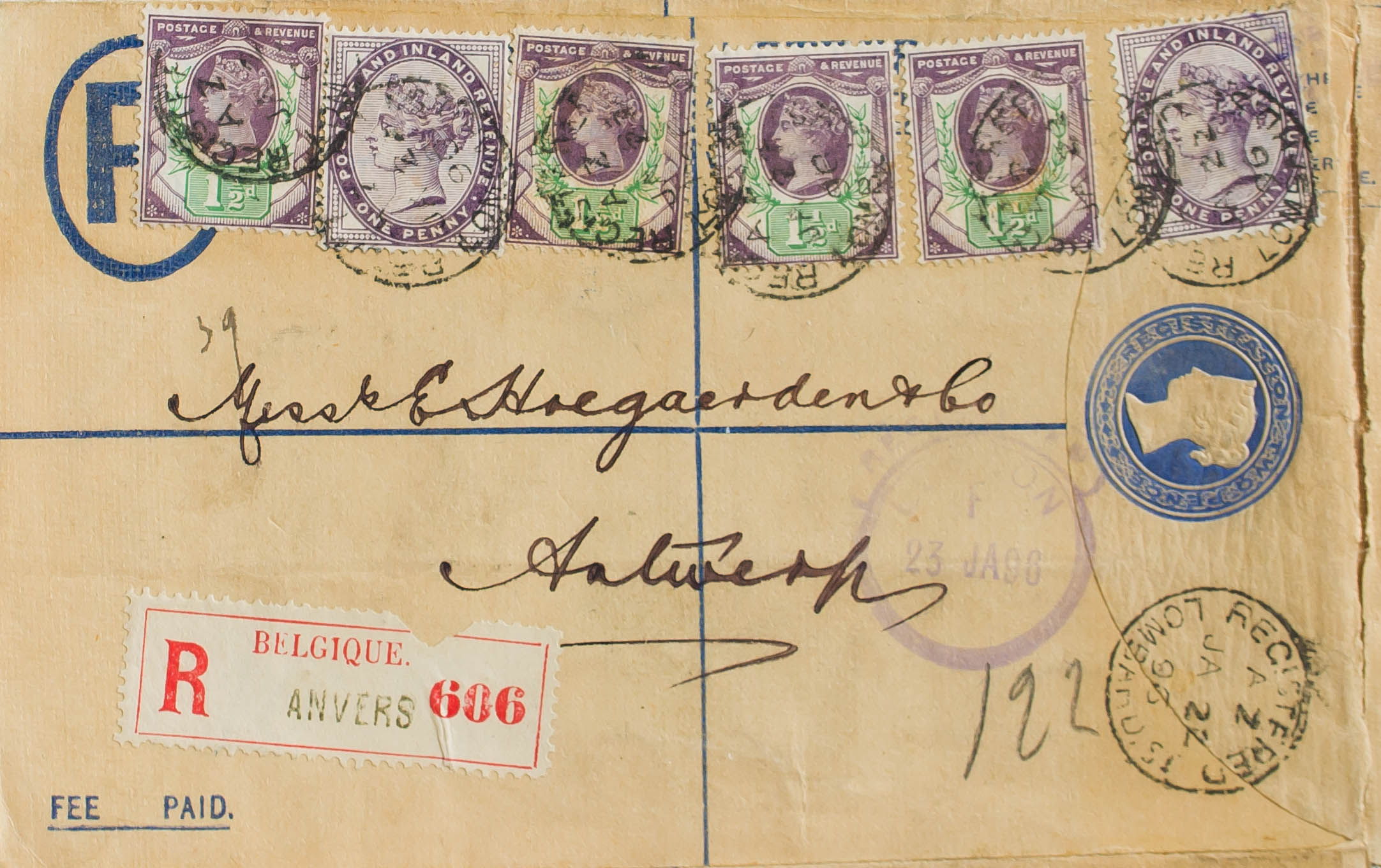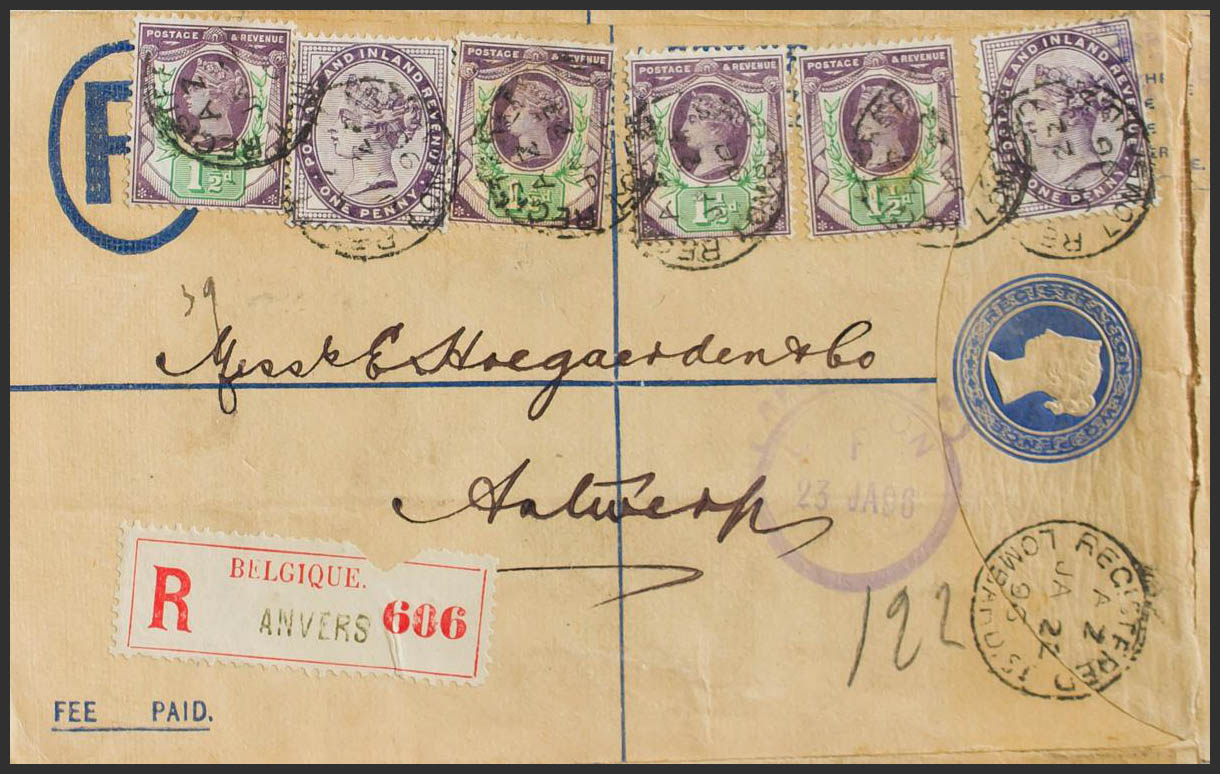 Yvert 73(2), 93(4). 1896. 2 p ultramar sobre Entero Postal Certificado de LONDRES a AMBERES (BELGICA), con franqueo complementario de 1 p violeta, dos sellos y 1 ½ p violeta y verde, cuatro sellos. Al dorso llegada. MAGNIFICA.