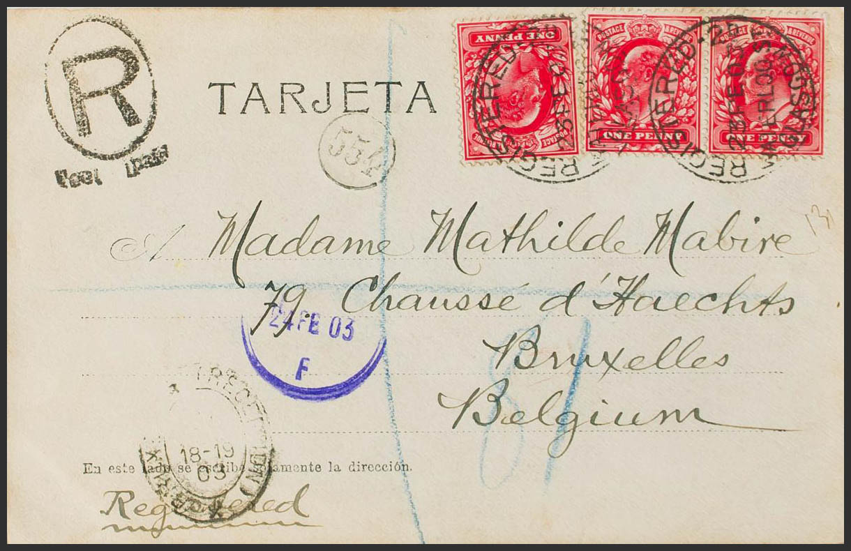 Yvert 107(3). 1903. 1 p rojo, tres sellos. Tarjeta Postal (con texto en español) Certificada de GLASGOW a BRUSELAS (BELGICA). Matasello REGISTERED / WATERLOO ST. / GLASGOW, en el frente llegada. MAGNIFICA.