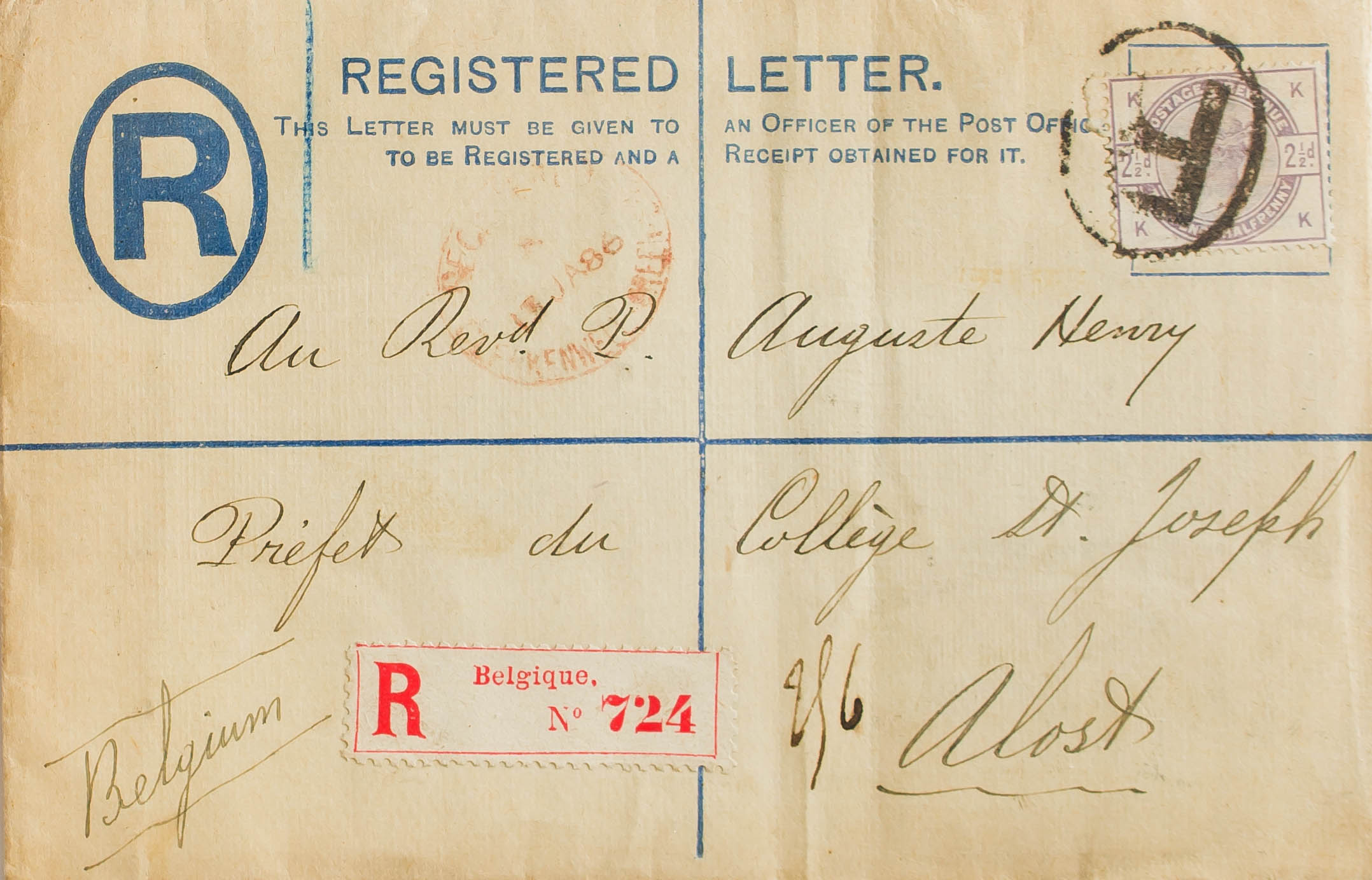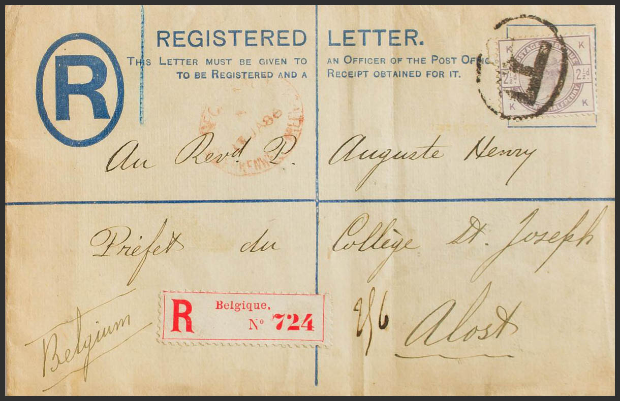Yvert 79. 1886. 2 p ultramar sobre Entero Postal Certificado de LONDRES a ALOST (BELGICA), con franqueo de 2 ½ p violeta. Matasello "R" y al dorso llegada. MAGNIFICA.