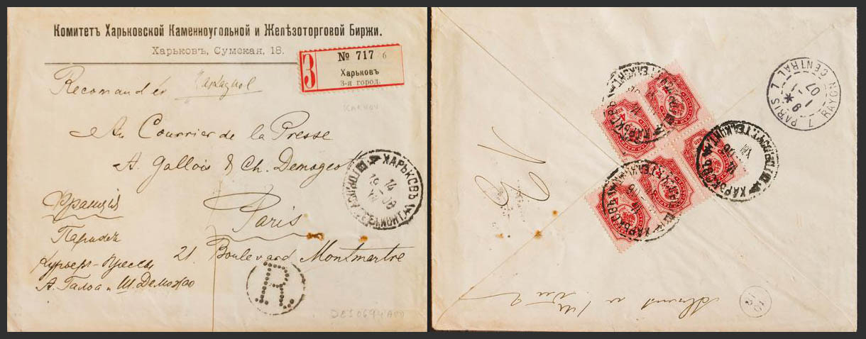 Yvert 41(59). 1906. 4 k rosa, cinco sellos (al dorso). Certificado de KARKOV a PARIS. MAGNIFICA.