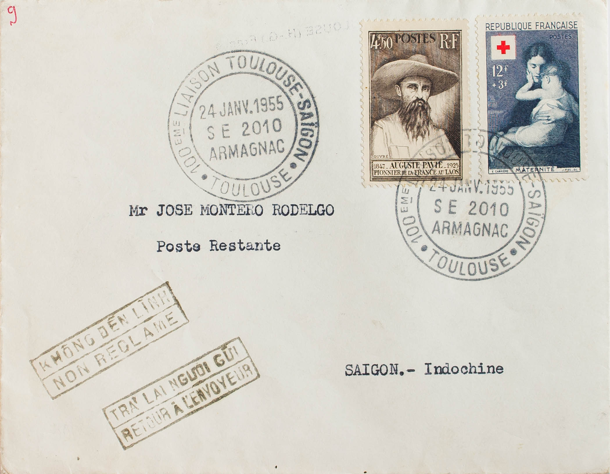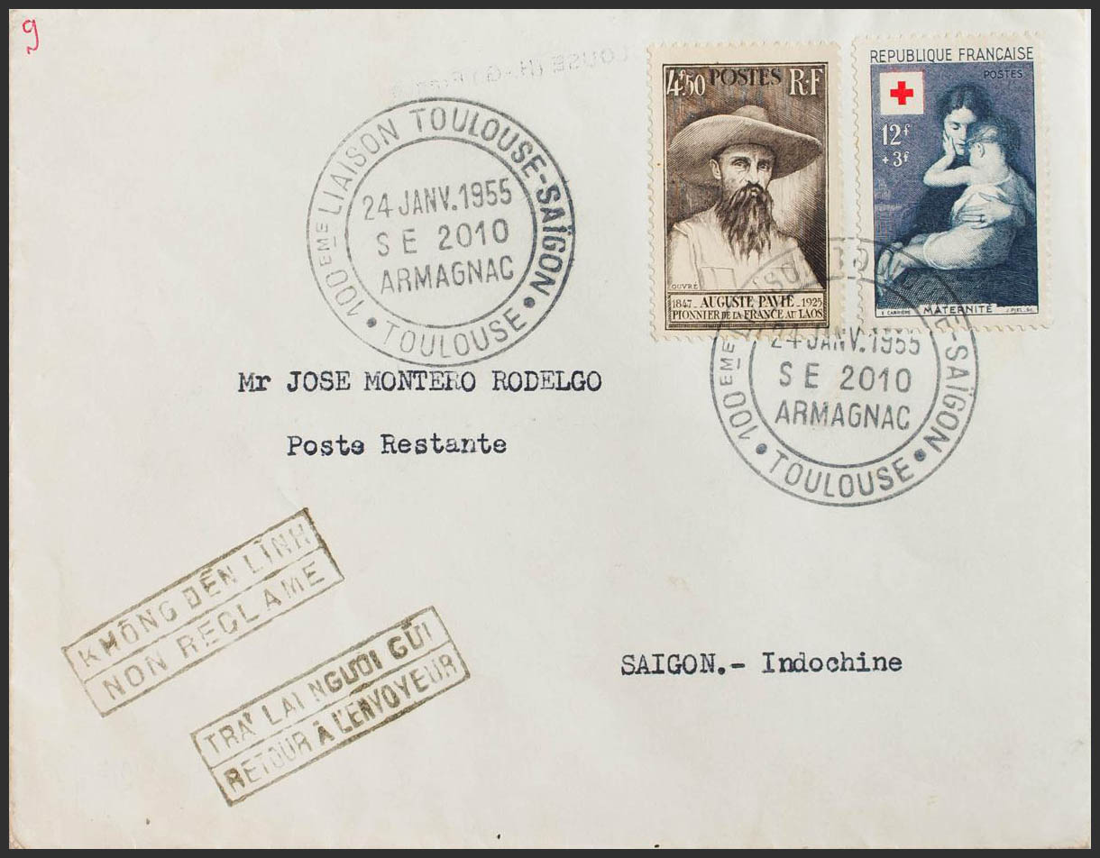 Yvert 784, 967. 1955. 4´50 fr castaño y 12 fr + 3 fr azul violeta. TOULOUSE a SAIGON (VIETNAM). Matasello 100 EME LIAISON TOULOUSE-SAIGON / SE 2010 / ARMAGNAC, al dorso llegada. MAGNIFICA.