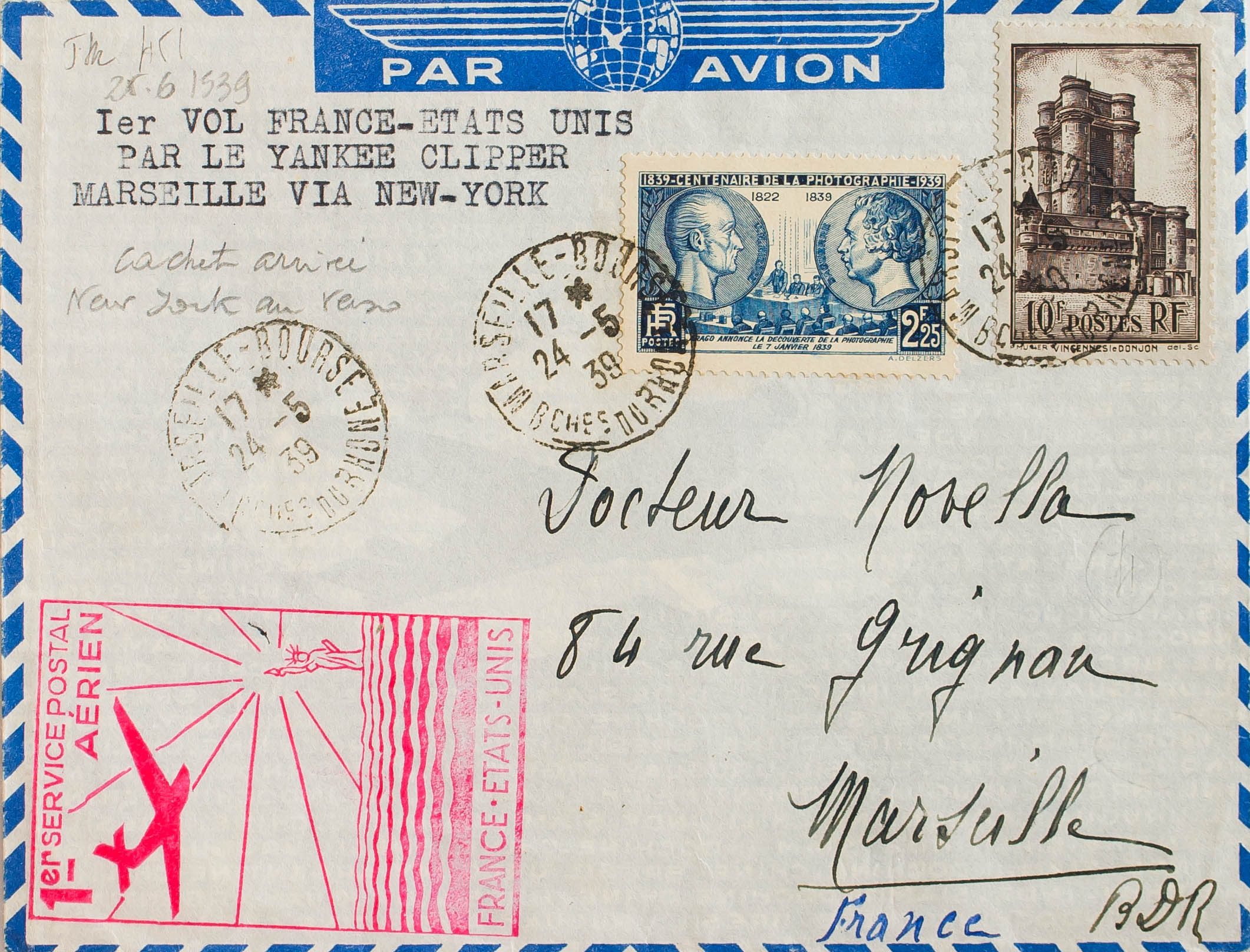 Yvert 393, 427. 1939. 10 fr castaño y 2´25 fr azul. Correo Aéreo dirigido a MARSELLA. En el frente marca I SERVICE POSTAL AERIEN / FRANCE ETATS-UNIS, en rojo y al dorso fechador NEW YORK N.Y. MAGNIFICA.