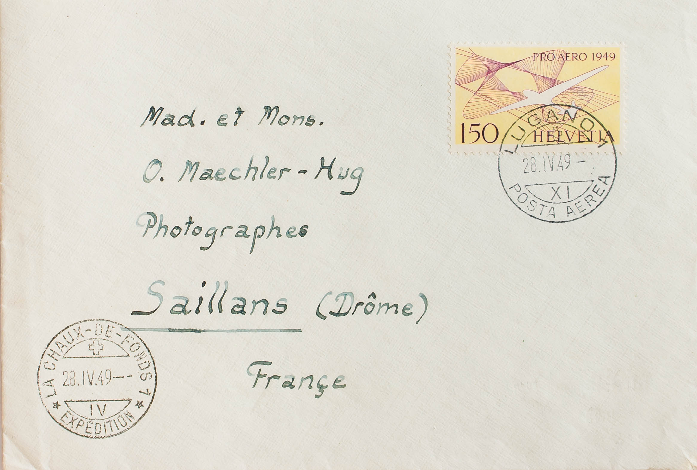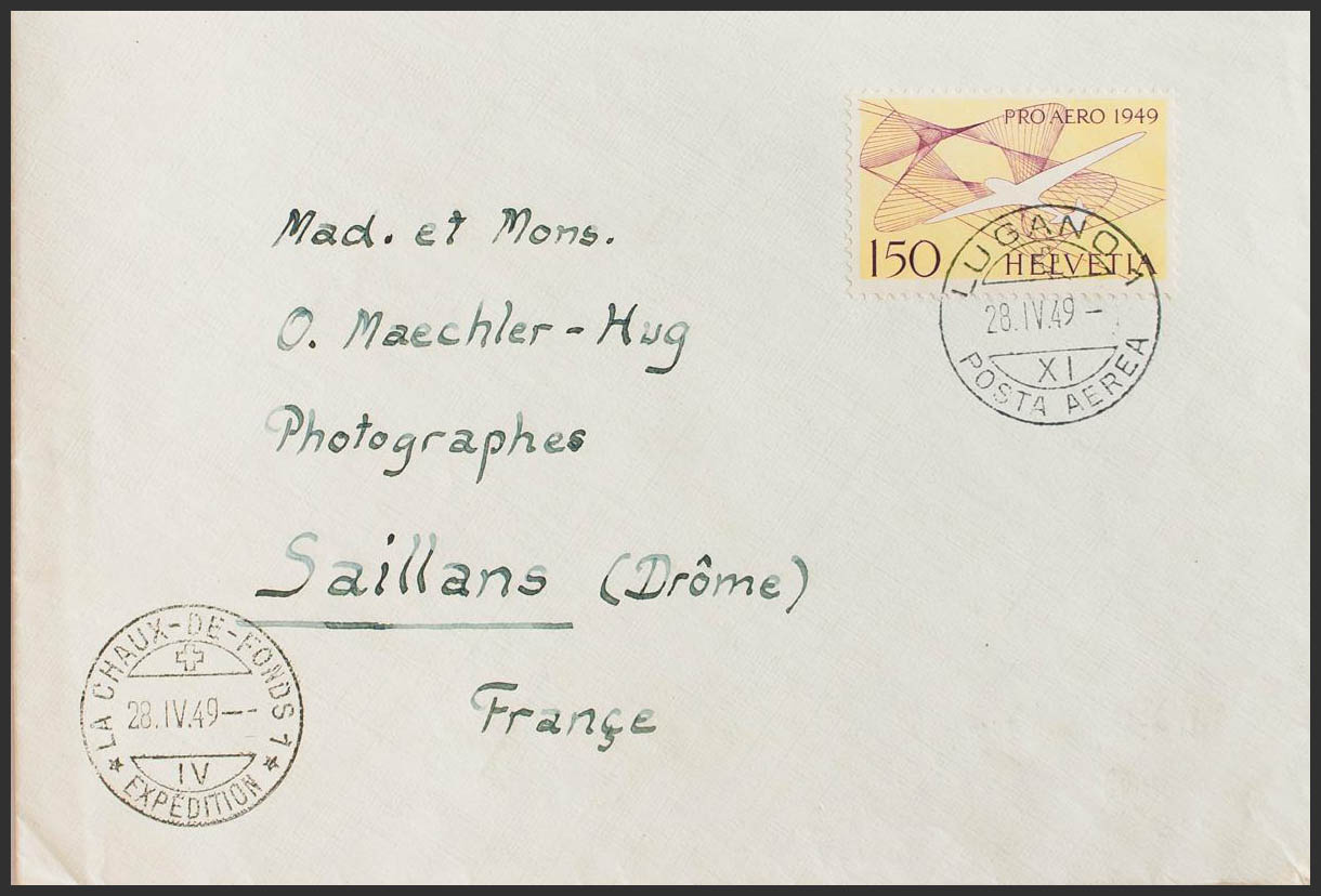 Yvert 44. 1949. 1´50 fr amarillo y violeta. LUGANO a SAILLANS. En el frente marca LA CHAUX-DE-FONDS / *EXPEDITION*. MAGNIFICA.