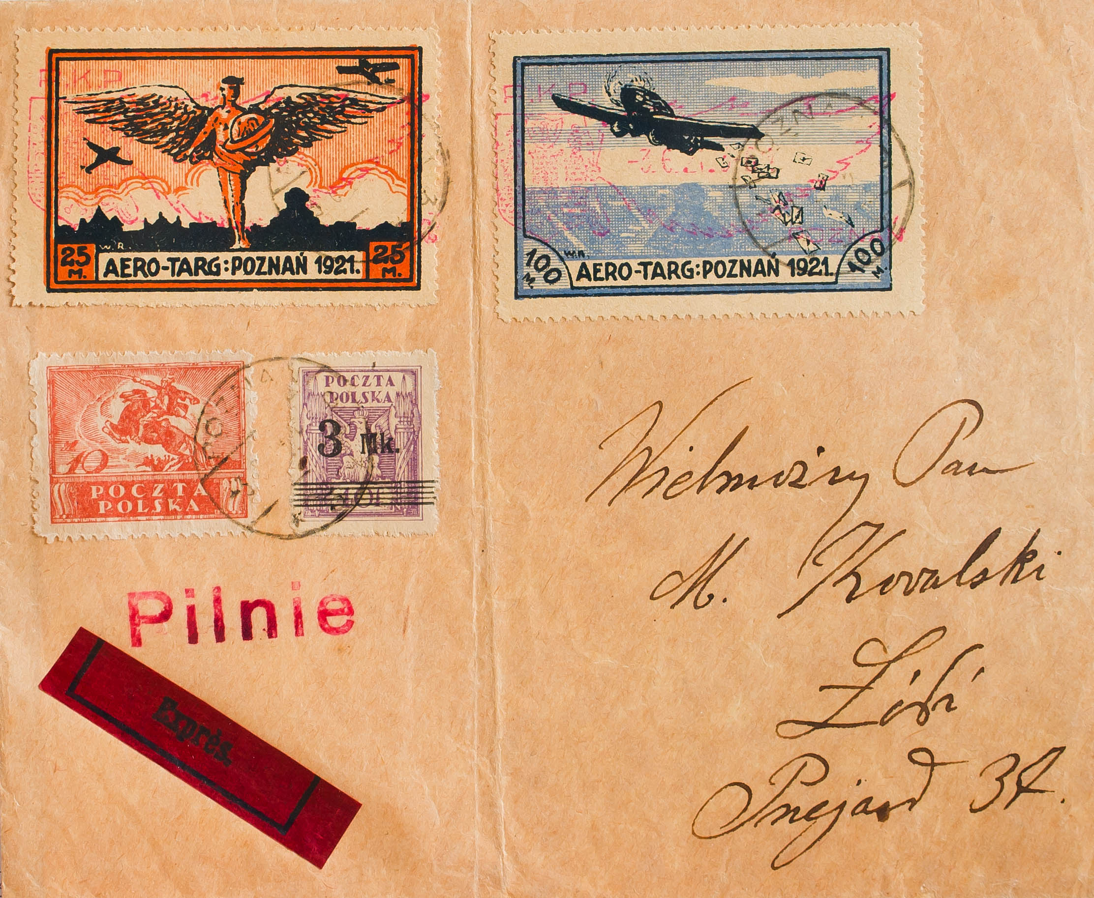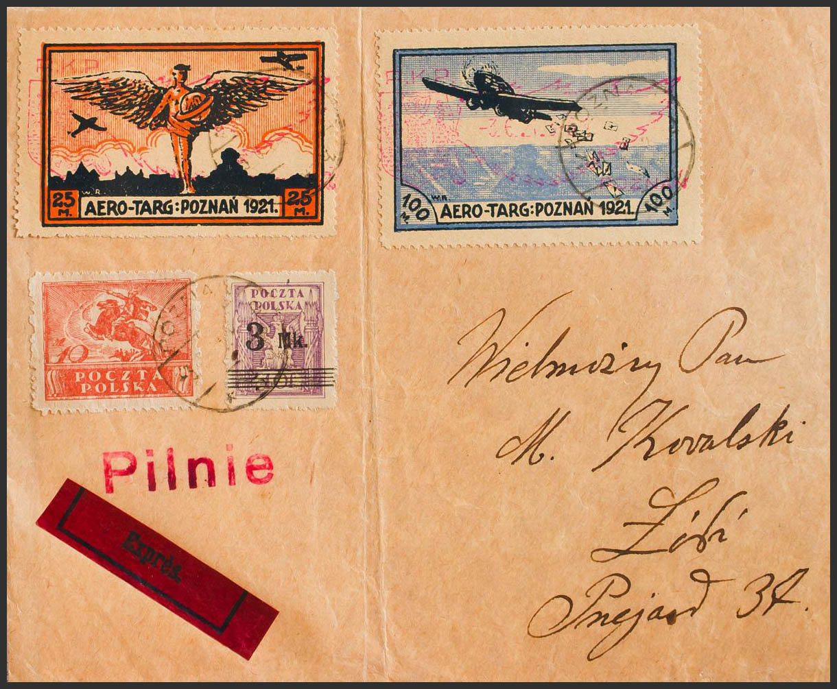 Yvert 216, 230. 1921. 10 m rojo castaño, 3 mk sobre 40 f violeta y viñetas de 25 m y 100 m AEROTARG. POZNAN a LODZ. Matasello P.K.P. / POZNAN, en rojo sobre las viñetas. MAGNIFICA Y RARA.