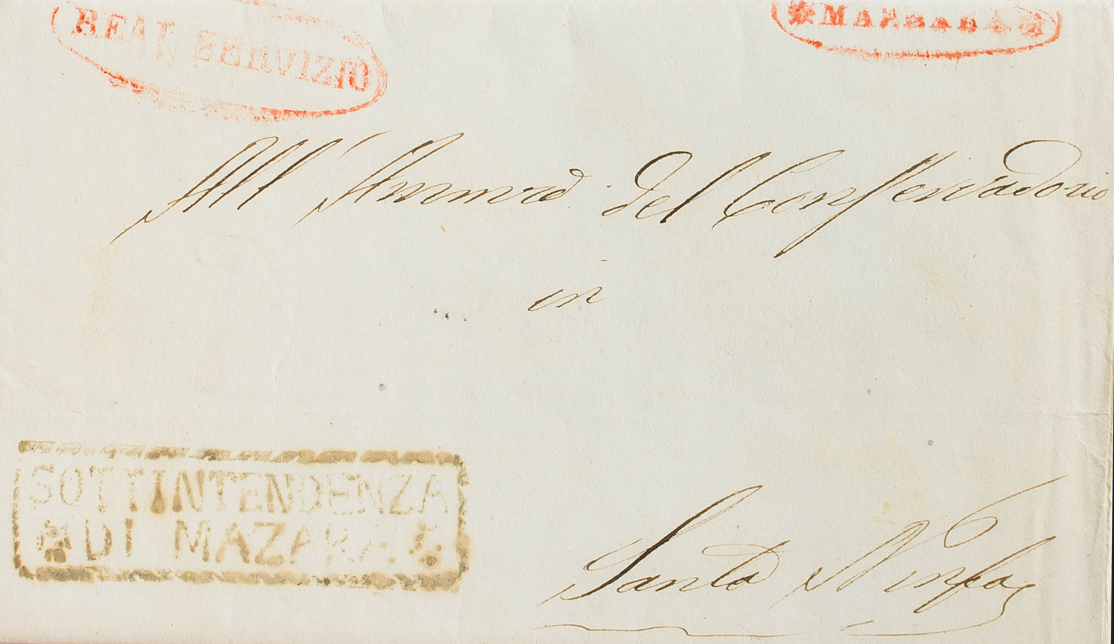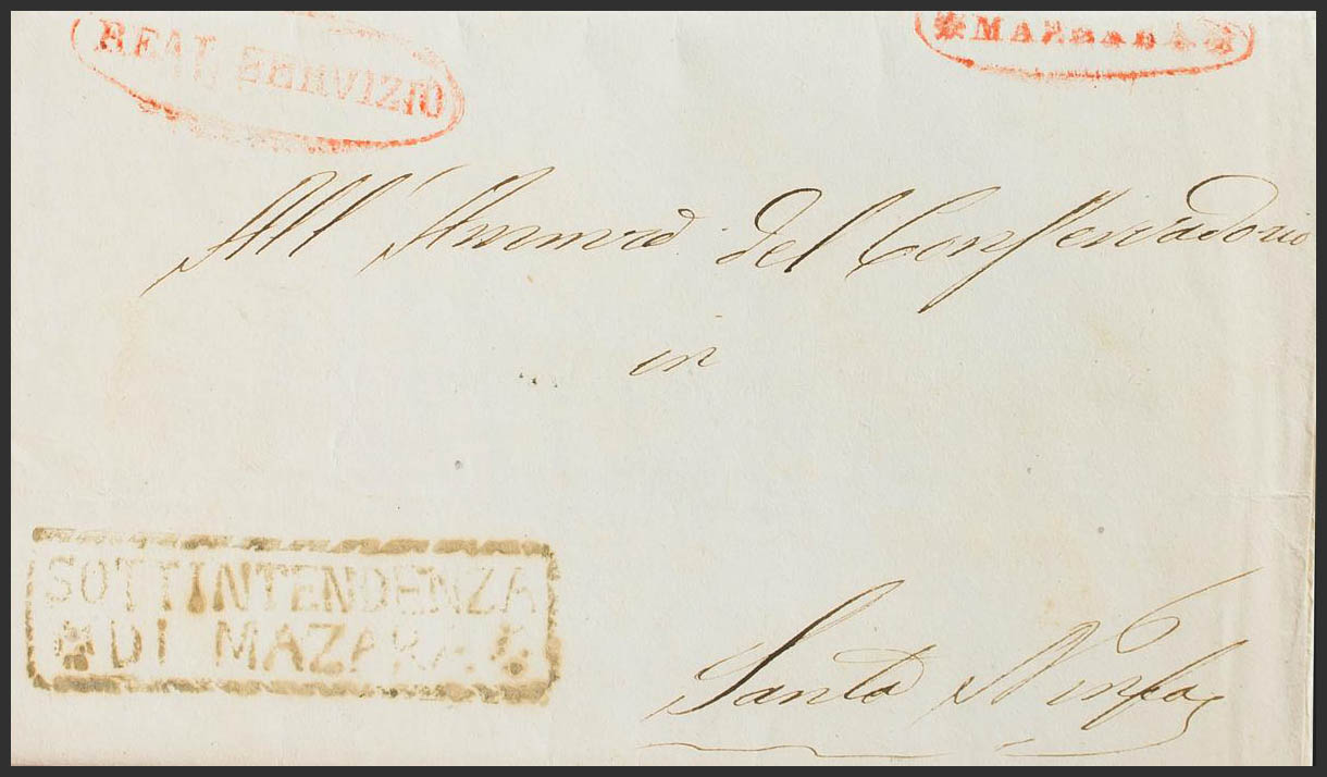 1850. CASTELVETRANO a SANTA NINFA. Marcas MAZARA y REAL SERVIZIO, ambas en rojo y marca rectangular SOTTINTENDENZA / DI MAZARA, en negro. MAGNIFICA.