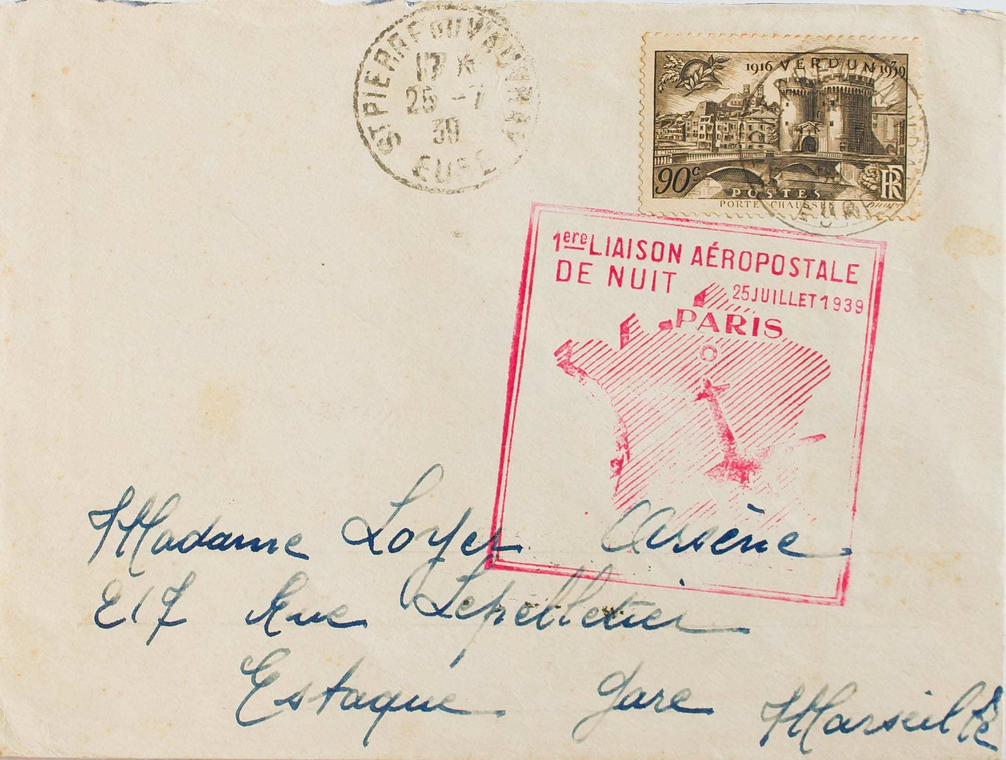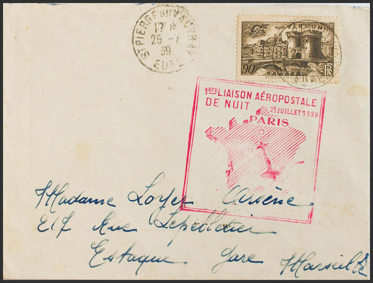 Yvert 445. 1939. 90 cts castaño. SAIN PIERRE DU VAVVRAY (FRANCIA) a ESTAQUE. En el frente marca 1º LIAISON AEROPOSTALE / DE NUIT / PARIS / MARSEILLE, al dorso llegada. MAGNIFICA.