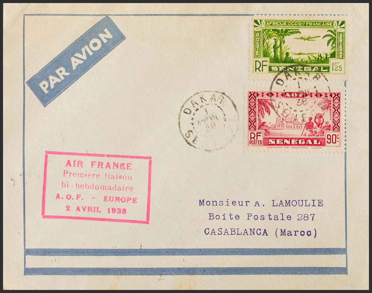 Yvert 128, Aéreo 4. 1938. 90 cts carmín y 1´25 fr verde claro. Correo Aéreo de DAKAR a CASABLANCA (MARRUECOS). En el frente marca AIR FRANCE / PREMIERE LIAISON / BI-HEBDOMADAIRE / A.O.F.-EUROPE, en lila y al dorso llegada. MAGNIFICA.