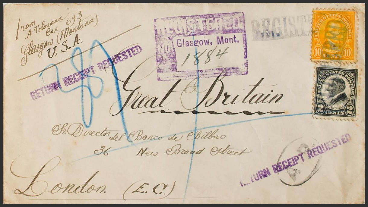 Yvert 237, 249. 1924. 10 ctvos amarillo y 2 ctvos negro. Certificado de GLASGOW (MONTANA, U.S.A.) a LONDRES (INGLATERRA). Marca REGISTERED sobre los sellos y en el frente lineal RETURN RECEIPT REQUESTED, en violeta y al dorso llegada. MAGNIFICO.