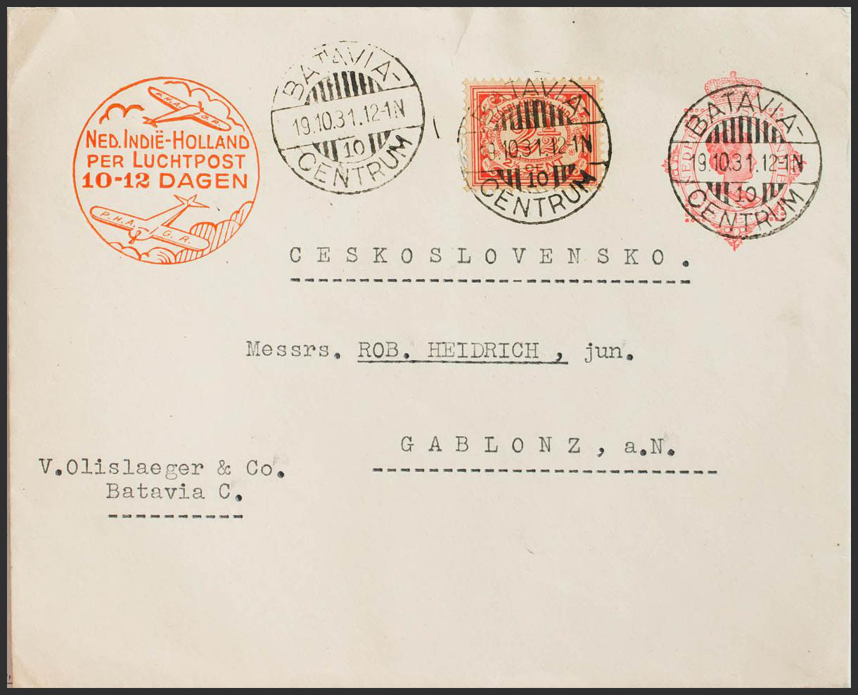 Yvert 132. 1931. 12 ½ cts carmín sobre Entero Postal Correo Aéreo de BATAVIA a GABLONZ (CHECOSLOVAQUIA), con franqueo complementario de 2 ½ cts rojo. En el frente marca MED.INDIE: HOLLAND / PER LUCHTPOST / 10-12 DAGEN, en rojo y al dorso tránsito. MAGNIFICO Y RARO.