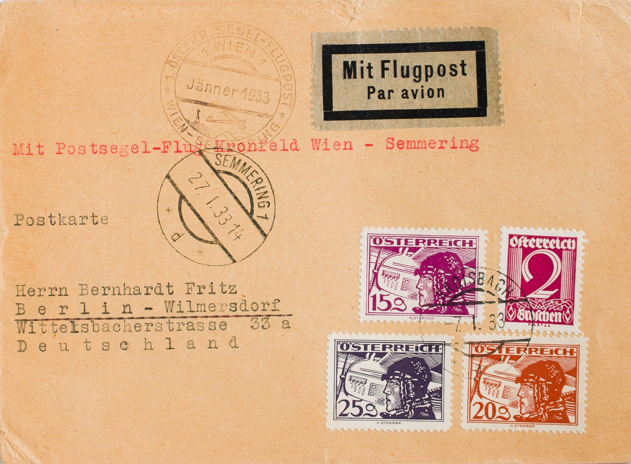 Yvert 18, 20, 21. 1933. 15 g, 20 g, 25 g y 2 g. Correo Aéreo de KROISBACH a BERLIN (ALEMANIA). En el frente marca 1 OSTERRISEGEL-FLUGPOST / WIEN-SEMMERING y llegada. MAGNIFICA Y RARA.
