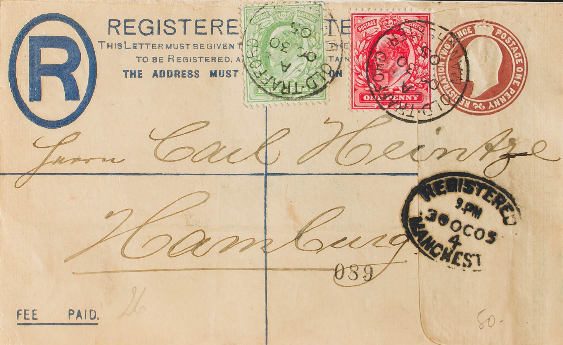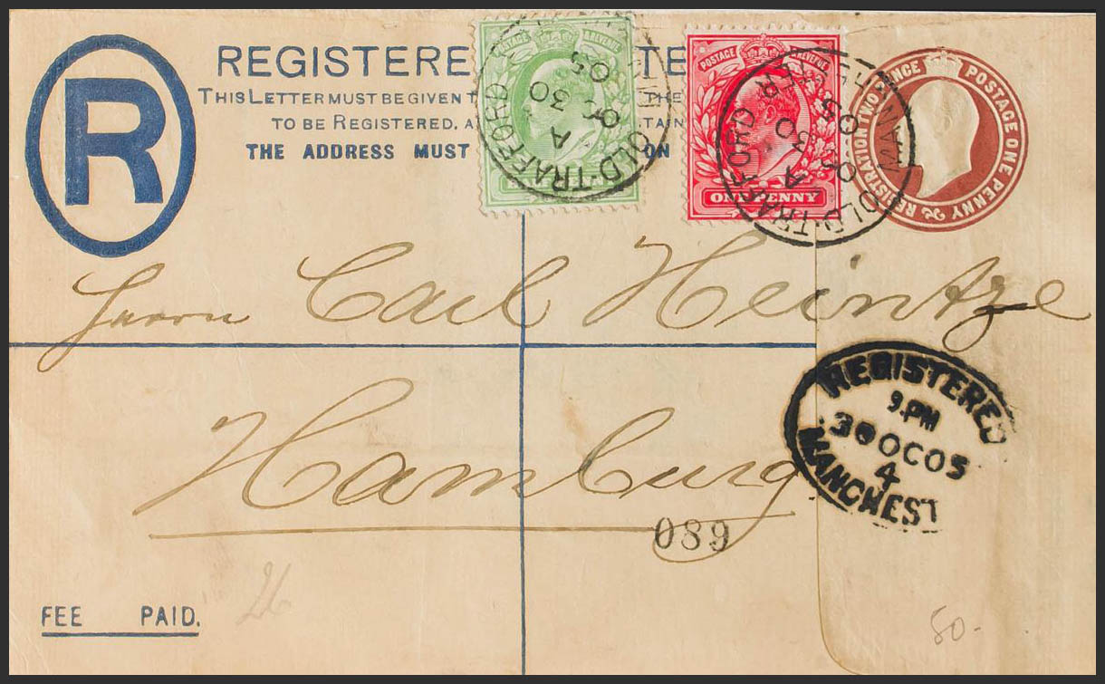 Yvert 106, 107. 1905. 1 p castaño sobre Entero Postal Certificado de MANCHESTER a HAMBURGO (ALEMANIA), con franqueo complementario de ½ p verde y 1 p rojo. MAGNIFICO.