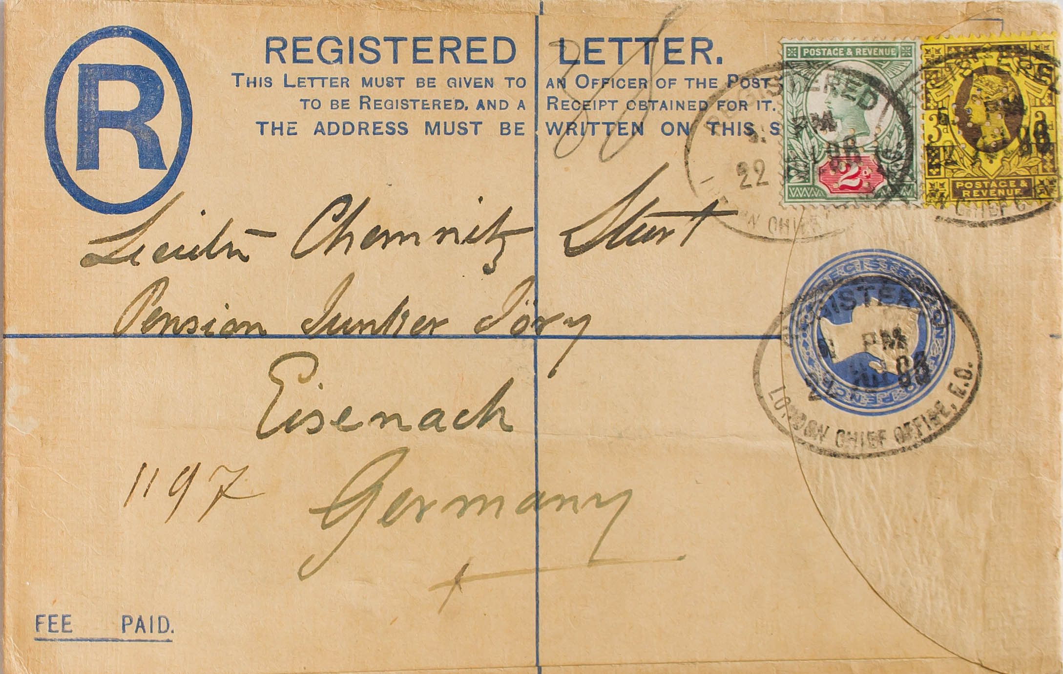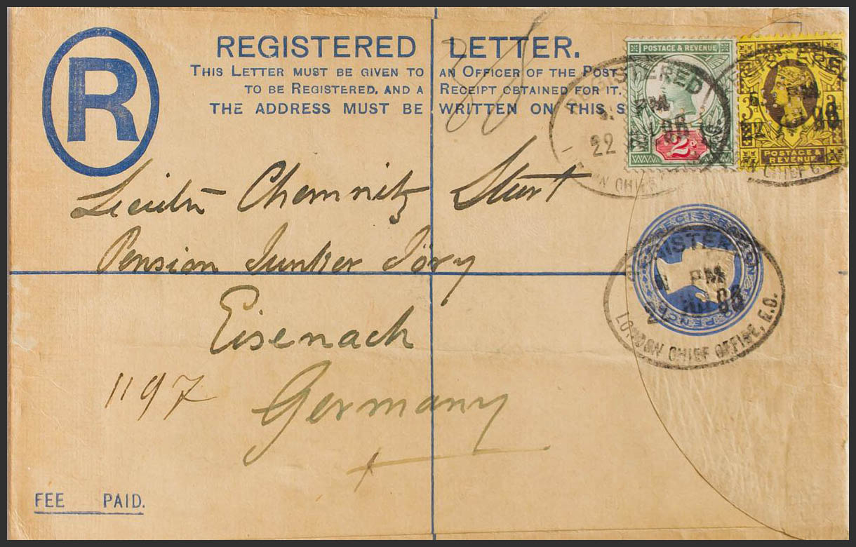 Yvert 94, 96. 1899. 2 p ultramar sobre Entero Postal Certificado de LONDRES a EISENACH (ALEMANIA), con franqueo complementario de 2 p verde y rosa y 3 p castaño sobre amarillo. MAGNIFICO.