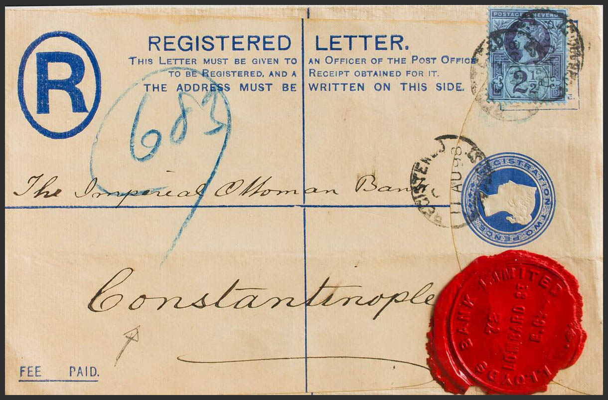 Yvert 95. 1898. 2 p ultramar sobre Entero Postal Certificado de LONDRES a CONSTANTINOPLA, con franqueo complementario de 2 ½ p violeta sobre azul. MAGNIFICO.