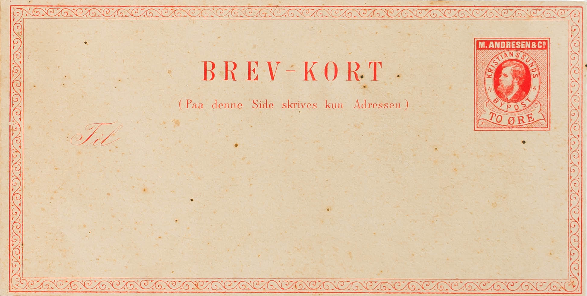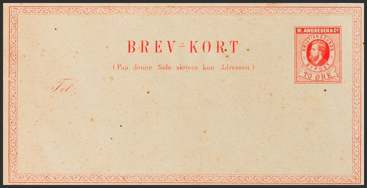(★)1880. TO ore naranja sobre Tarjeta Entero Postal Privada. M.ANDRESEN AND Cº KRISTIANSSUNDS. MAGNIFICA.