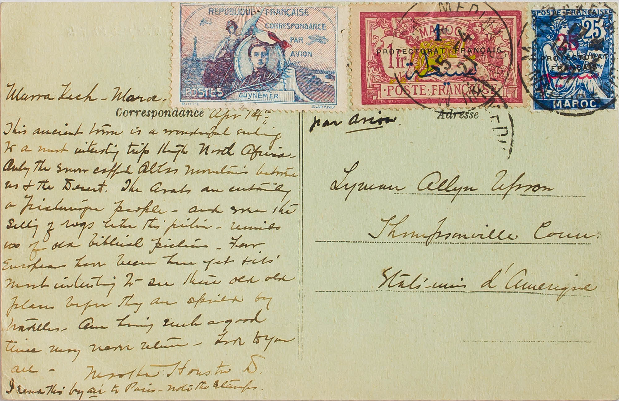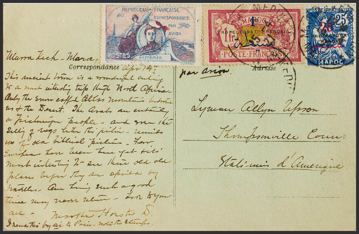 Yvert 44, 51. 1921. 25 cts sobre 25 cts azul, 1 pts sobre 1 fr carmín y viñeta precursora GUYNEMER. Tarjeta Postal de MARRAKECH a THOMPSONVILLE (U.S.A.). Al dorso tránsito CASABLANCA. MAGNIFICA.