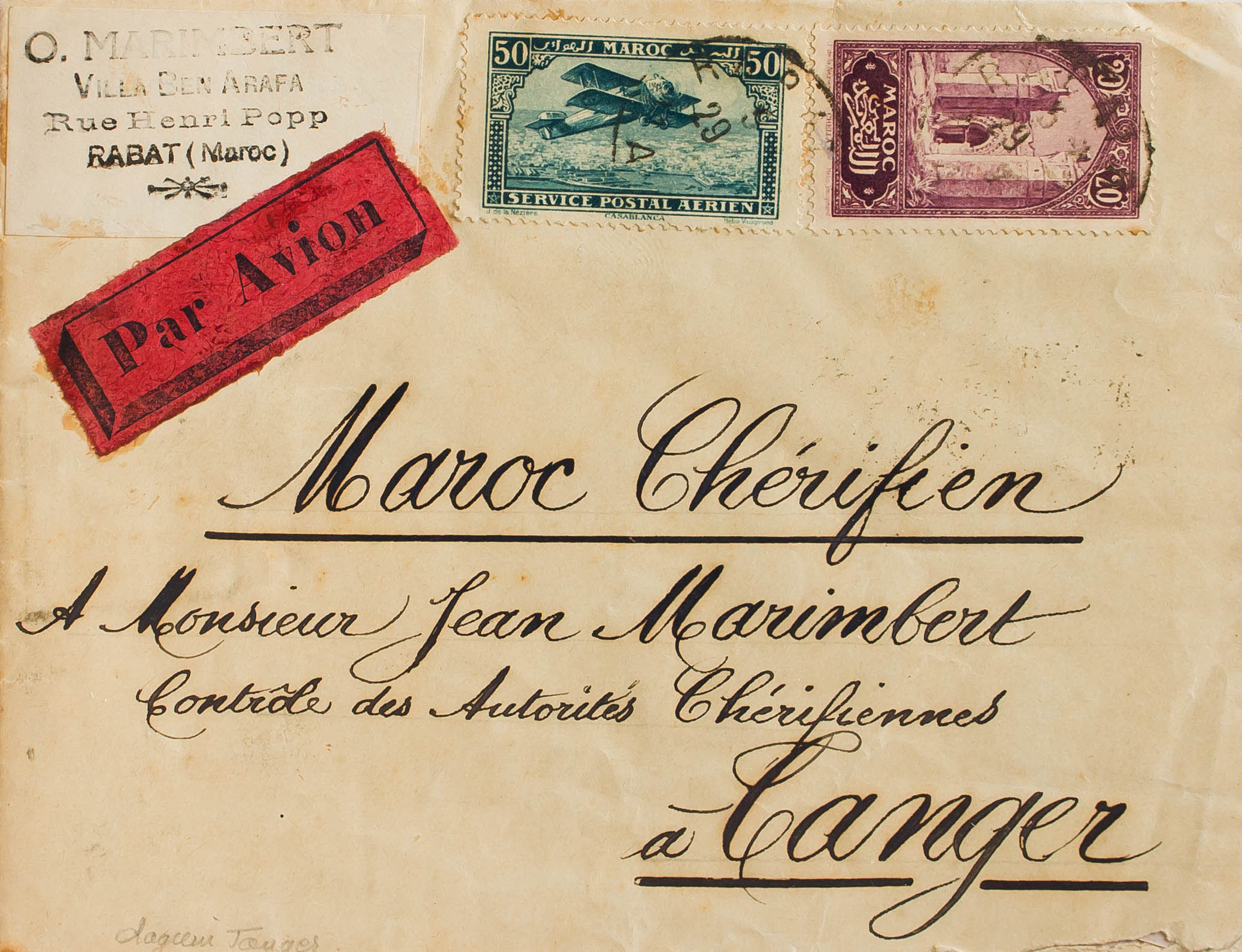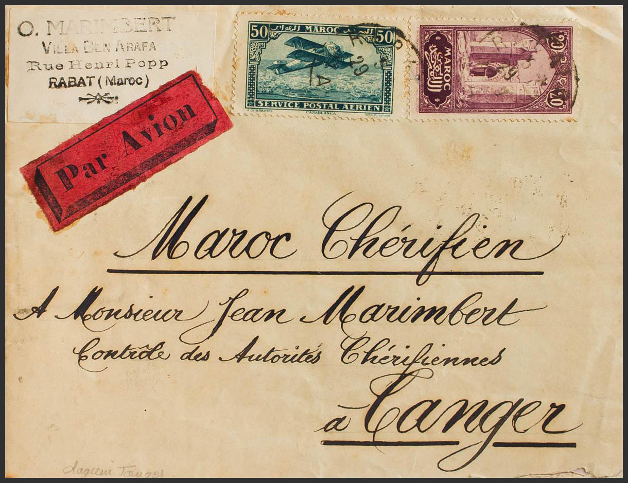 Yvert 105, Aéreo 3. 1927. 20 cts violeta y 50 cts azul verde. RABAT a TANGER. Al dorso llegada. MAGNIFICA.