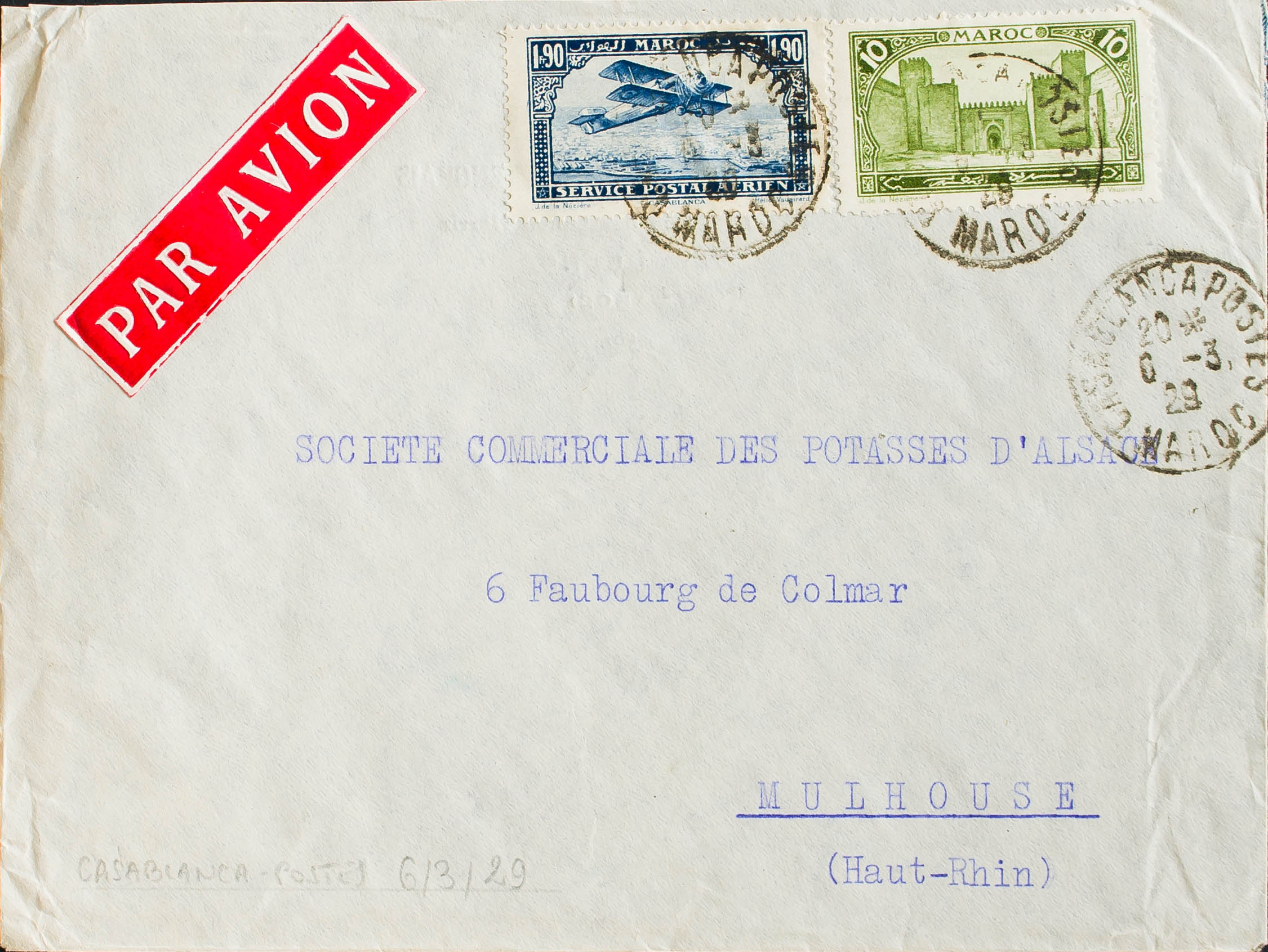 Yvert 102, Aéreo 9. 1929. 10 cts verde y 1´90 fr azul. CASABLANCA a MULHOUSE (FRANCIA). MAGNIFICA.