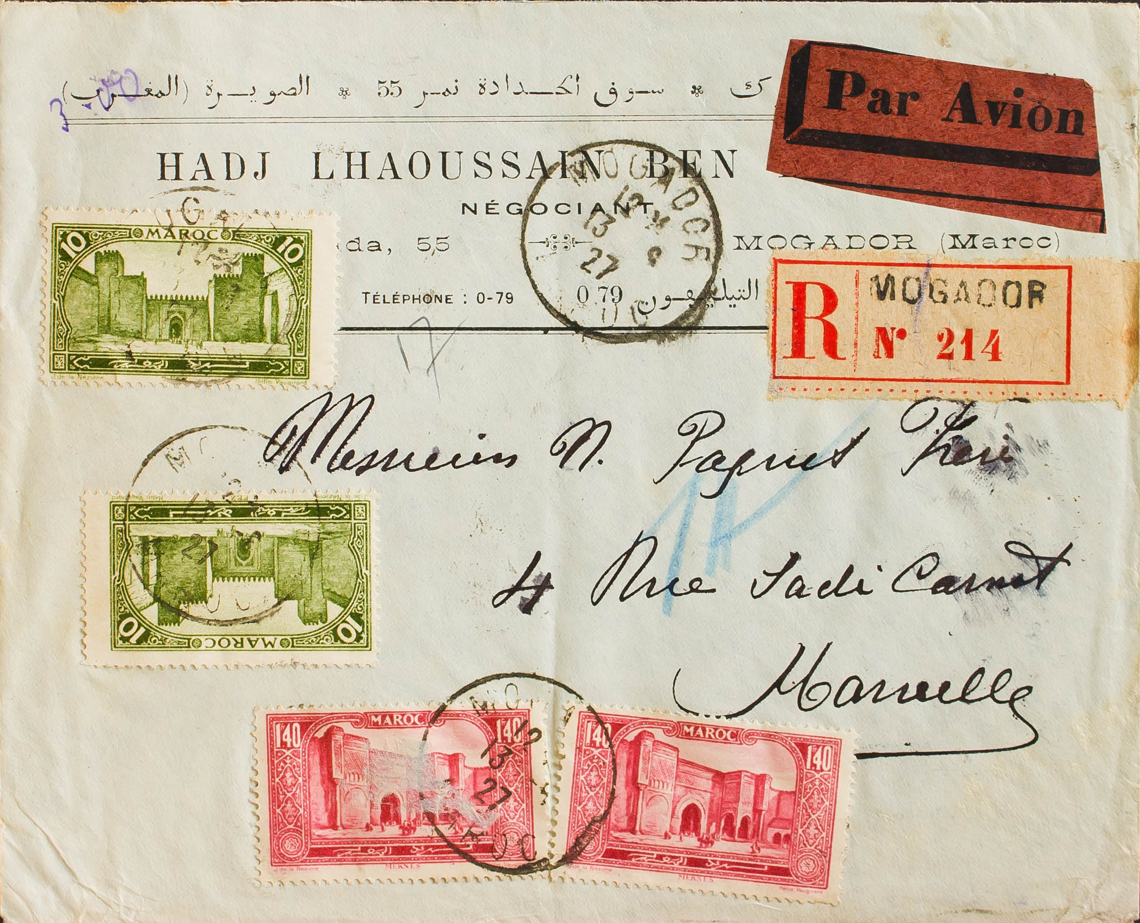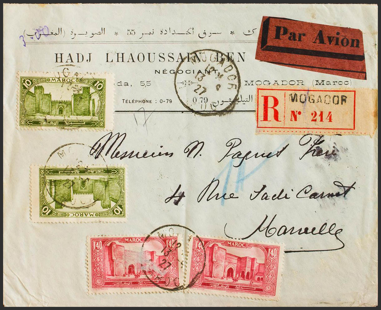 Yvert 102(2), 118(2). 1927. 10 cts verde, dos sellos y 1´40 f carmÃn rosa, dos sellos. Certificado de MOGADOR a MARSELLA (FRANCIA). Al dorso llegada. MAGNIFICO.