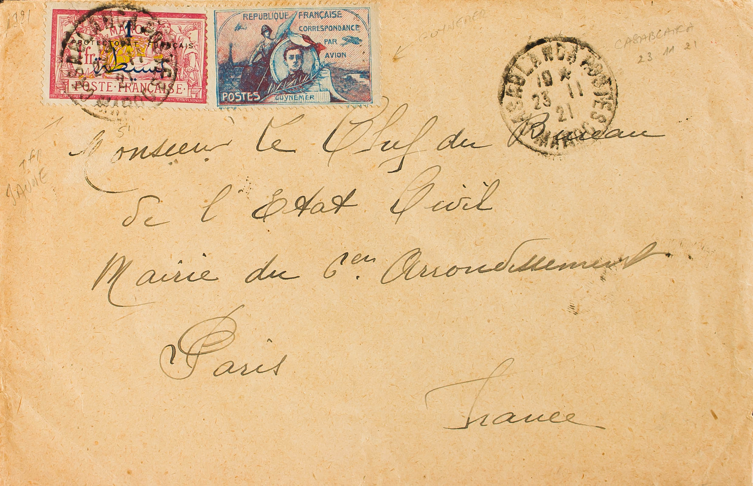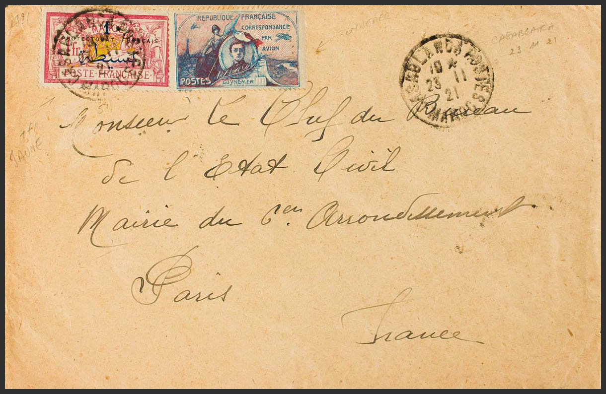 Yvert 51. 1921. 1 pts sobre 1 fr carmÃn y viñeta precursora GUYNEMER. CASABLANCA a PARIS (FRANCIA). MAGNIFICA.