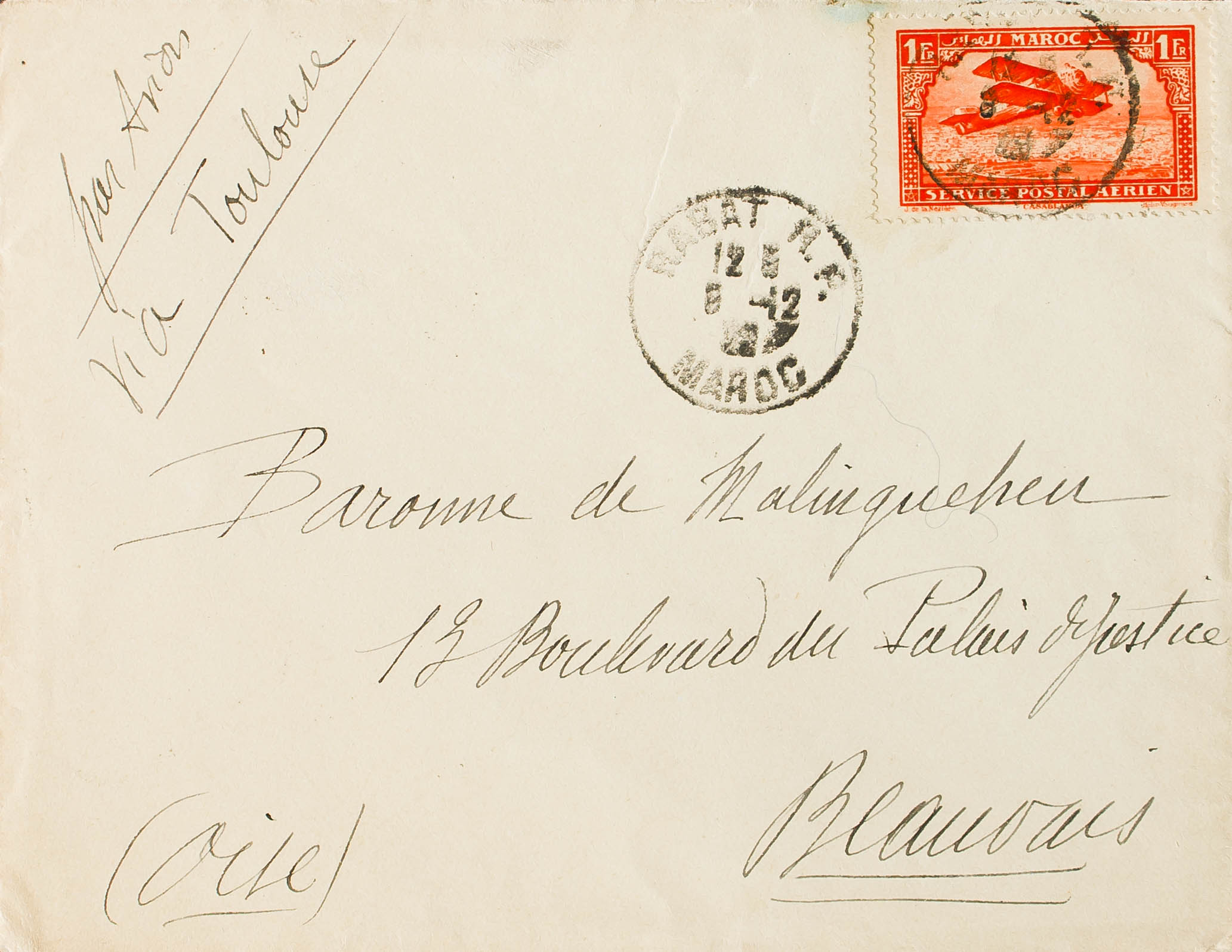 Yvert 7. 1922. 1 fr naranja. RABAT a BEAUVAIS (FRANCIA). Al dorso llegada. MAGNIFICA.