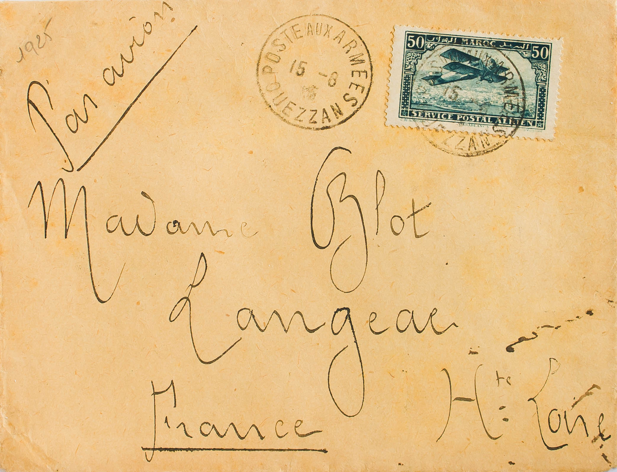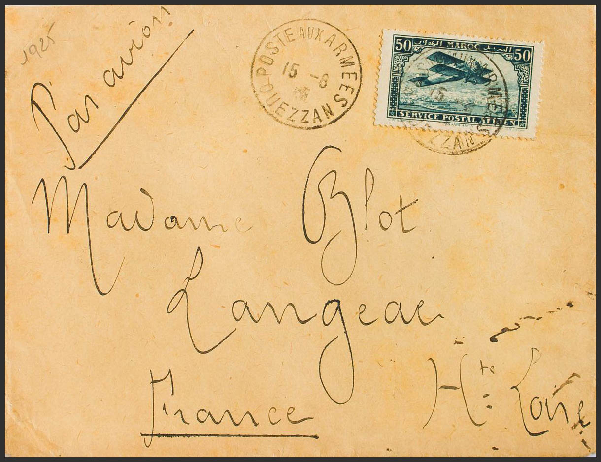 Yvert 3. 1925. 50 cts azul verde. UEZAN a LANGEAC (FRANCIA). Matasello POSTE AUX ARMEES / OUEZZAN, al dorso llegada. MAGNIFICA.
