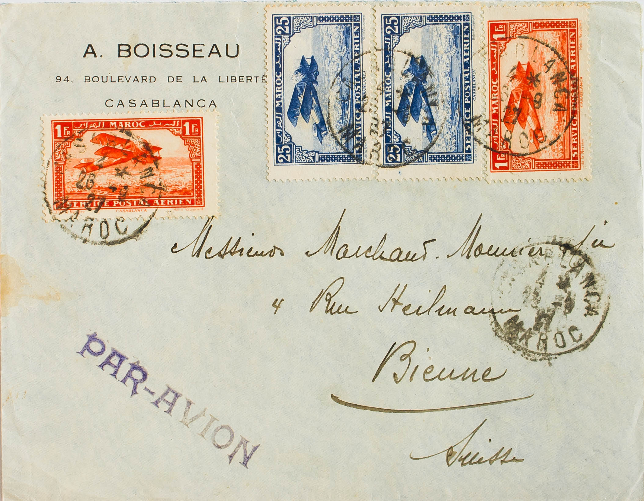 Yvert 2(2), 7(2). 1927. 25 cts azul, dos sellos y 1 fr naranja, dos sellos. CASABLANCA a BIENNE (SUIZA). MAGNIFICA.