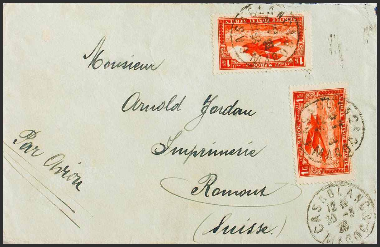 Yvert 7(2). 1925. 1 fr naranja, dos sellos. CASABLANCA a ROMONT (SUIZA). Al dorso llegada. MAGNIFICA.